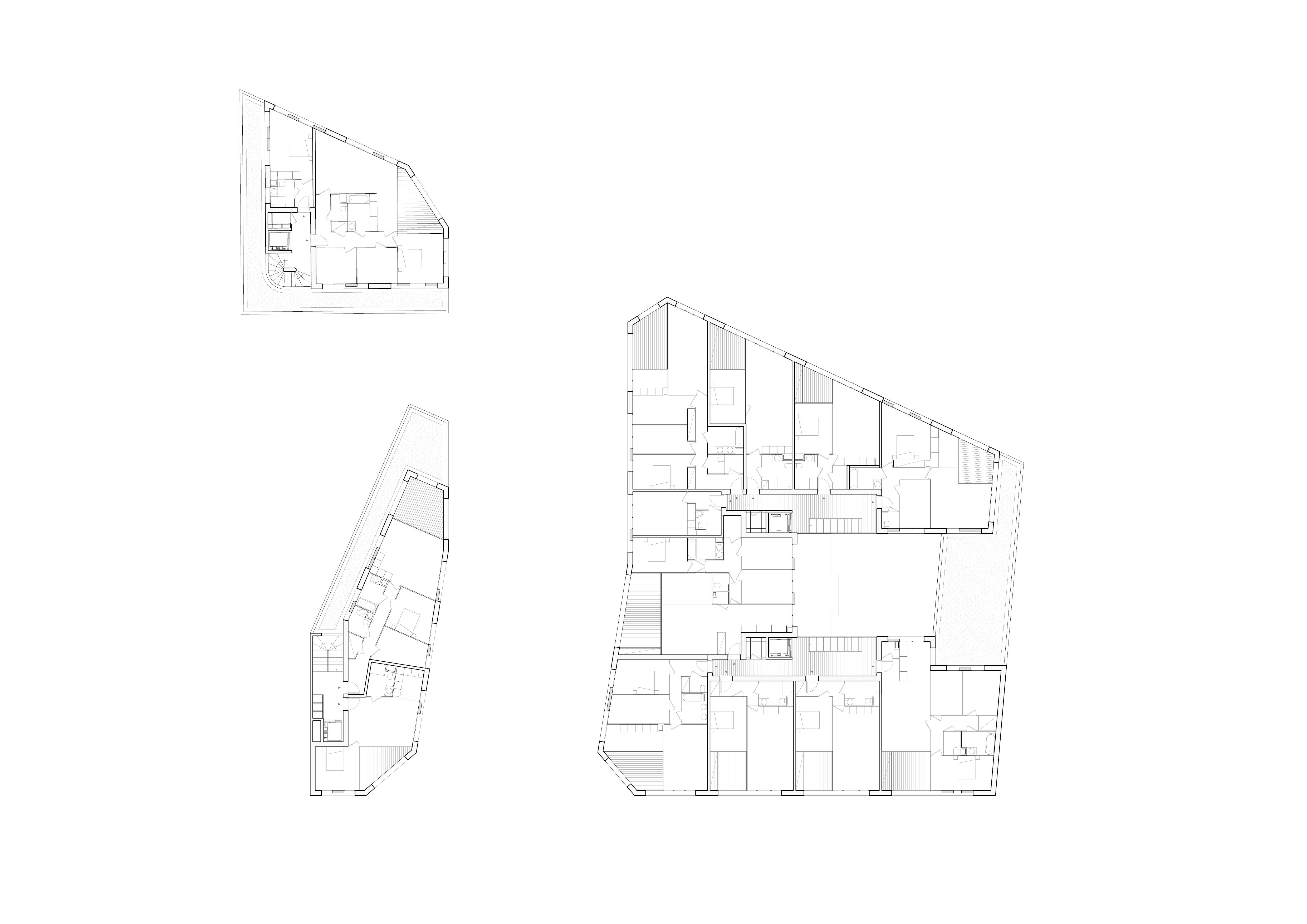 Un travail minutieux d’accroche et de transition est effectué avec les constructions mitoyennes. Ainsi la volumétrie des trois bâtiments a été travaillée en étroite relation avec la distribution et l’organisation des logements, de manière à minimiser les vis-à-vis de tous les bâtiments, nouveaux et anciens, et de préserver également le droit à la lumière et aux vues pour tous.