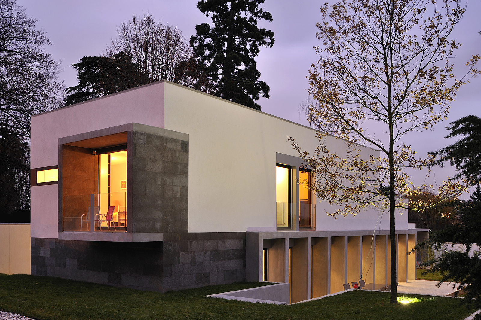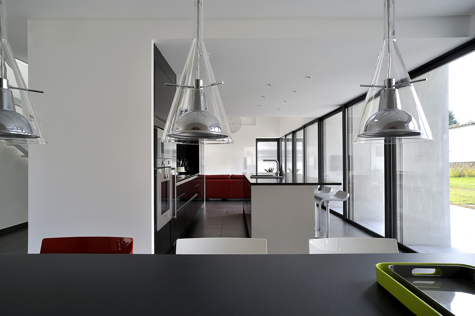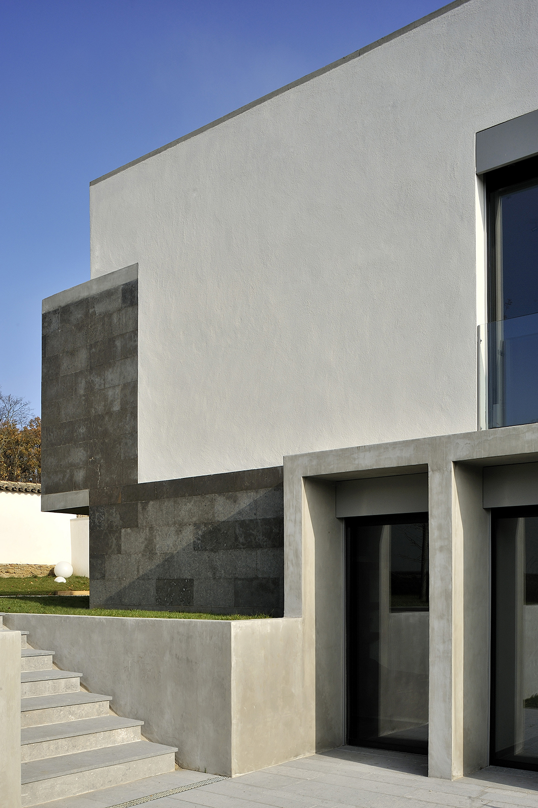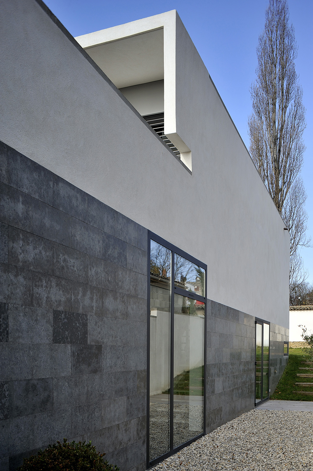 L’implantation du bâti et sa volumétrie simple suivent la forme de la parcelle. Les façades épurées présentent des pleins ponctués de larges baies favorisant l’éclairage naturel de la maison. Depuis l’entrée, la maison s’élève progressivement d’un niveau par les retraits successifs des toitures terrasses, utilisées ici pour diminuer l’impact de la masse bâtie dans le paysage. La façade sud-ouest présente une succession de meneaux d’une hauteur d’étage faisant office de brise-soleil et ménageant un cadrage visuel remarquable sur le jardin extérieur. Dans cette continuité, les pierres en soubassement soulignent la différenciation entre le rez-de-chaussée et l’étage.