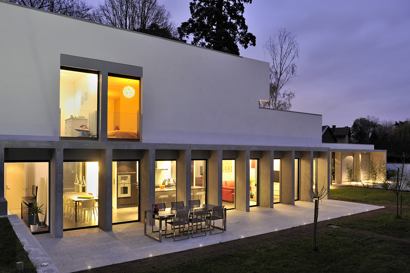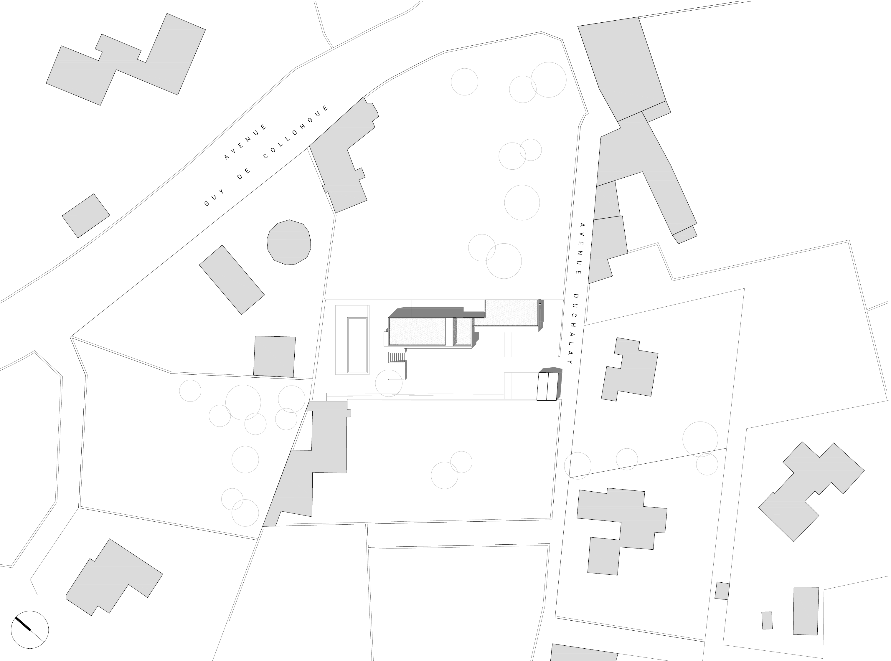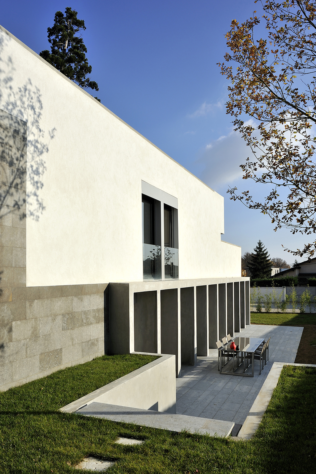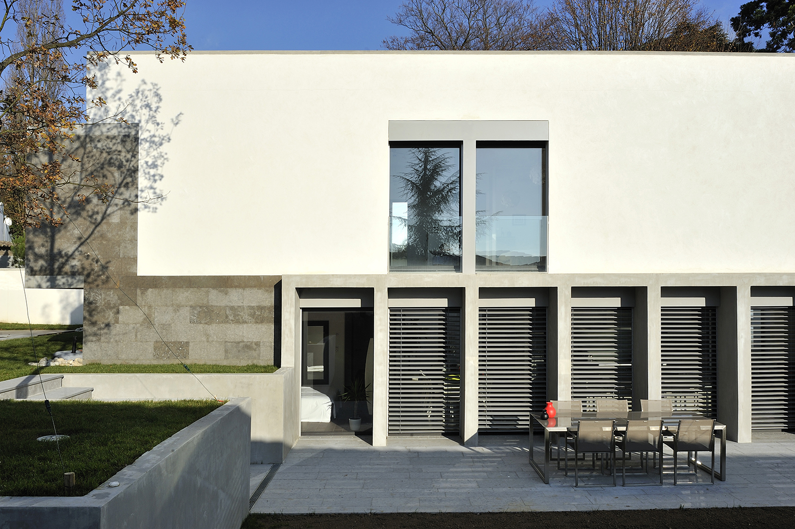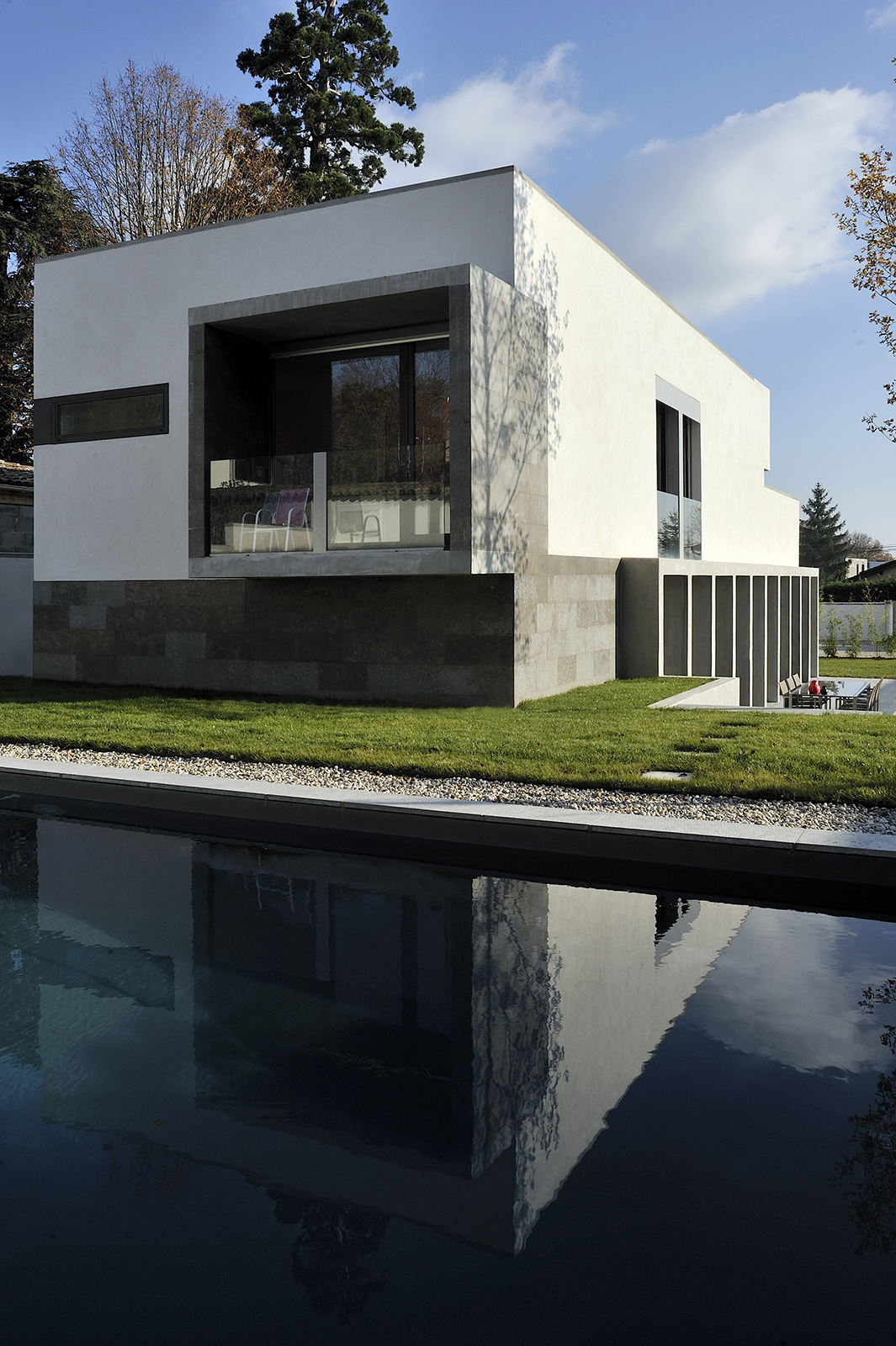 L’implantation du bâti et sa volumétrie simple suivent la forme de la parcelle. Les façades épurées présentent des pleins ponctués de larges baies favorisant l’éclairage naturel de la maison. Depuis l’entrée, la maison s’élève progressivement d’un niveau par les retraits successifs des toitures terrasses, utilisées ici pour diminuer l’impact de la masse bâtie dans le paysage. La façade sud-ouest présente une succession de meneaux d’une hauteur d’étage faisant office de brise-soleil et ménageant un cadrage visuel remarquable sur le jardin extérieur. Dans cette continuité, les pierres en soubassement soulignent la différenciation entre le rez-de-chaussée et l’étage.