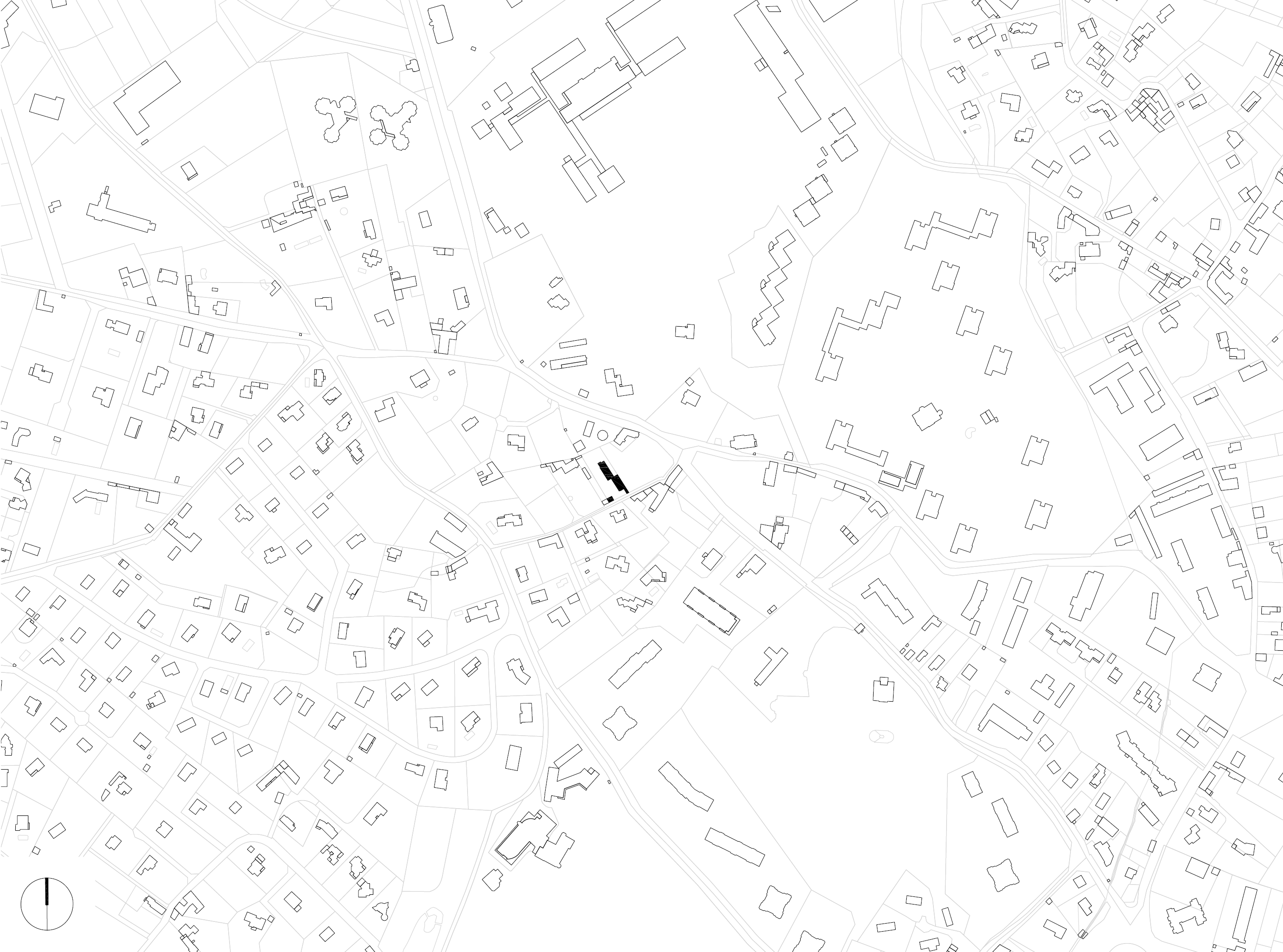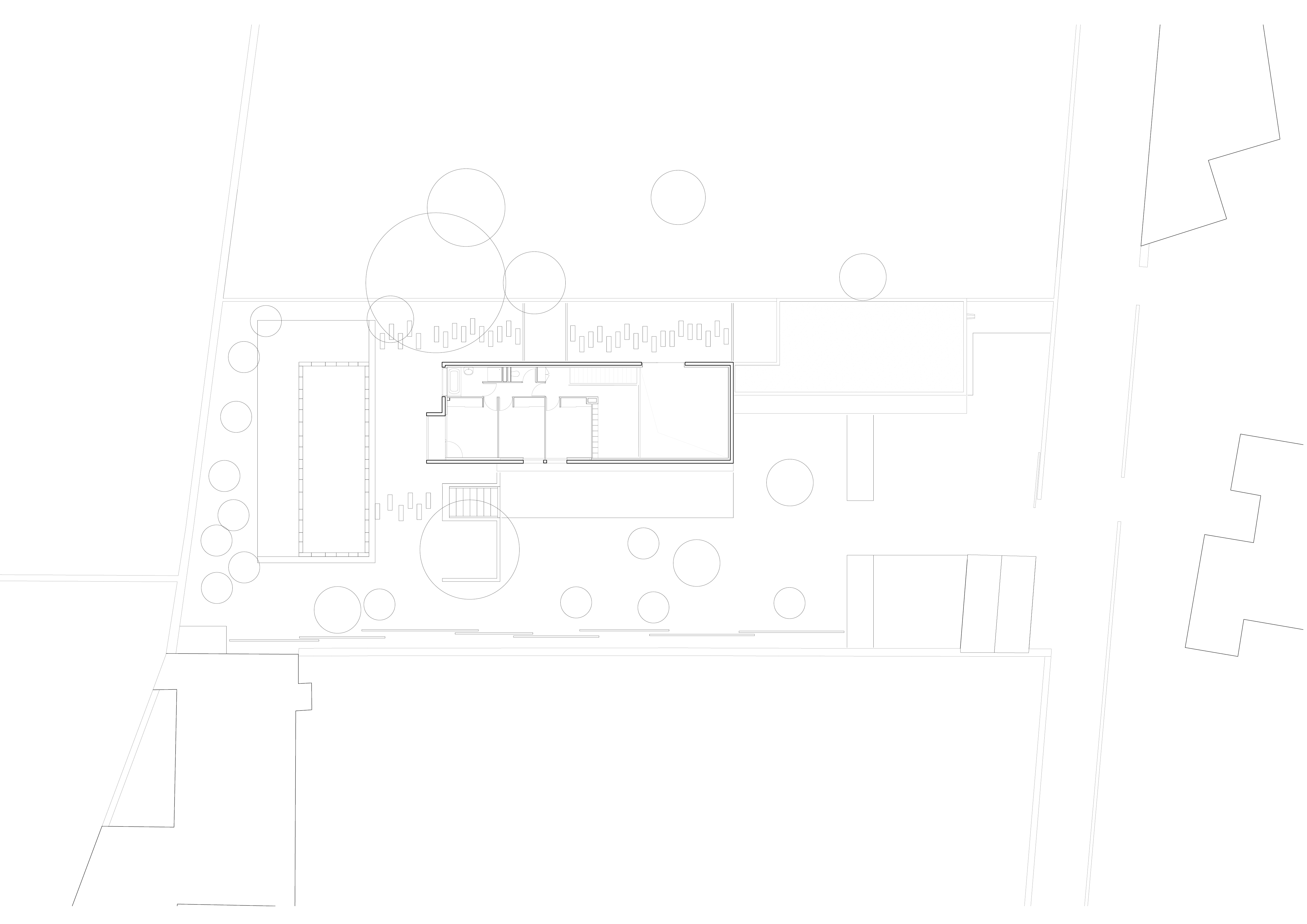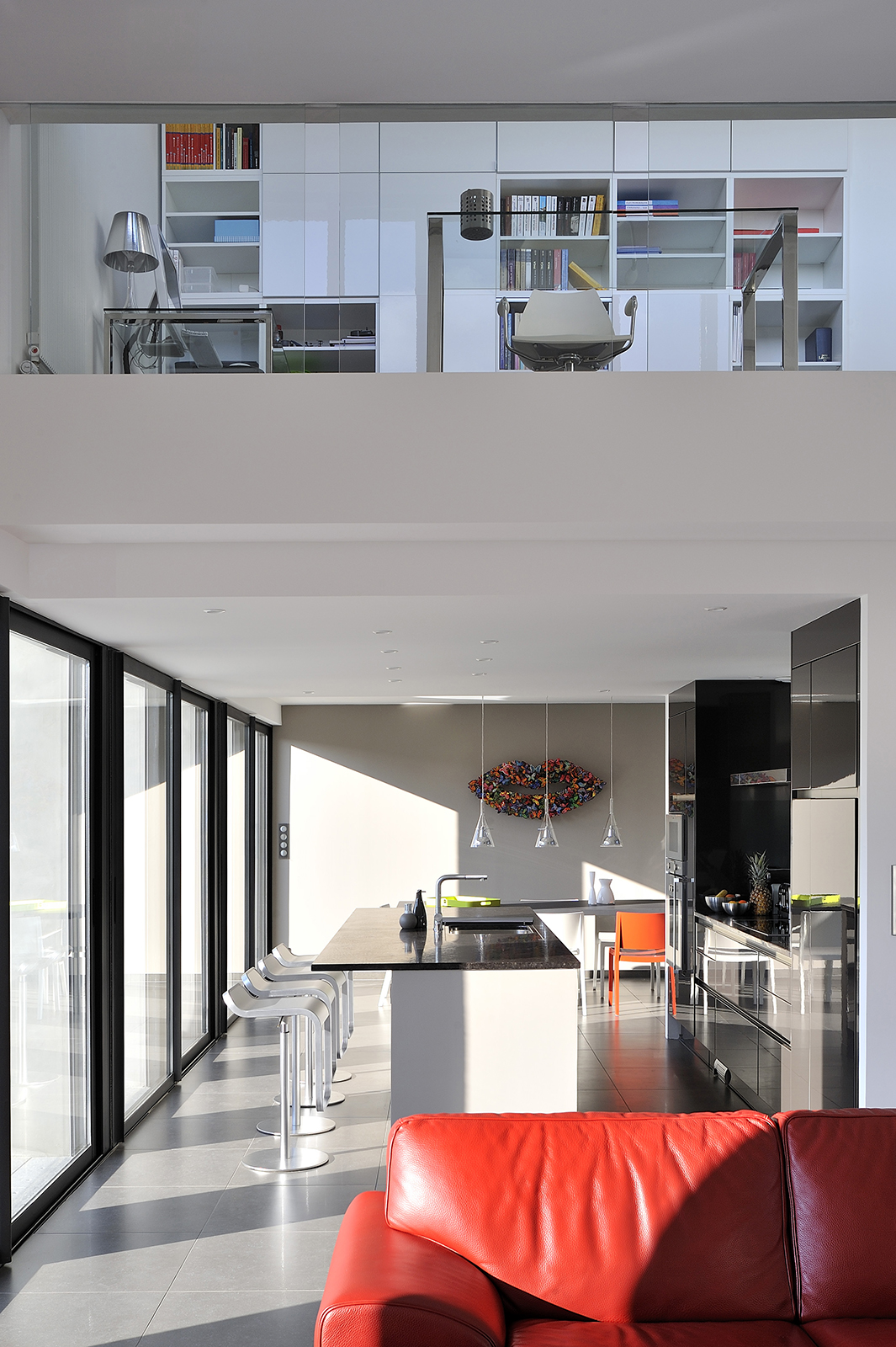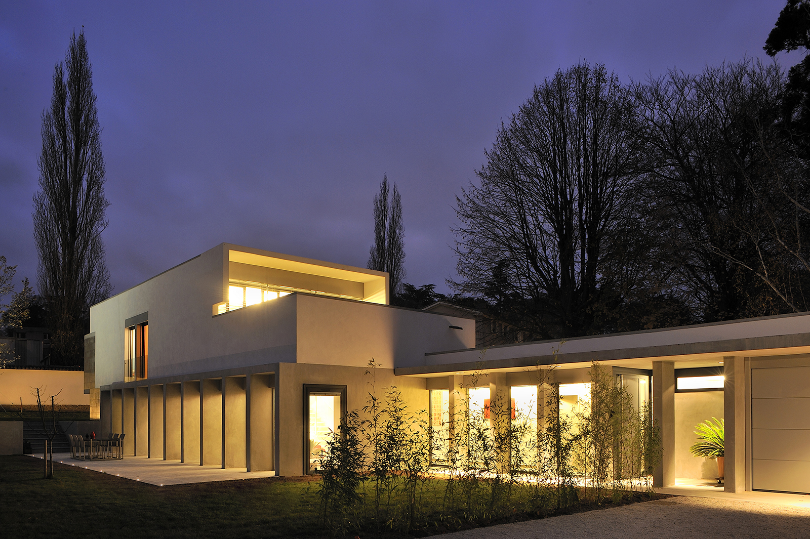 L’implantation du bâti et sa volumétrie simple suivent la forme de la parcelle. Les façades épurées présentent des pleins ponctués de larges baies favorisant l’éclairage naturel de la maison. Depuis l’entrée, la maison s’élève progressivement d’un niveau par les retraits successifs des toitures terrasses, utilisées ici pour diminuer l’impact de la masse bâtie dans le paysage. La façade sud-ouest présente une succession de meneaux d’une hauteur d’étage faisant office de brise-soleil et ménageant un cadrage visuel remarquable sur le jardin extérieur. Dans cette continuité, les pierres en soubassement soulignent la différenciation entre le rez-de-chaussée et l’étage.