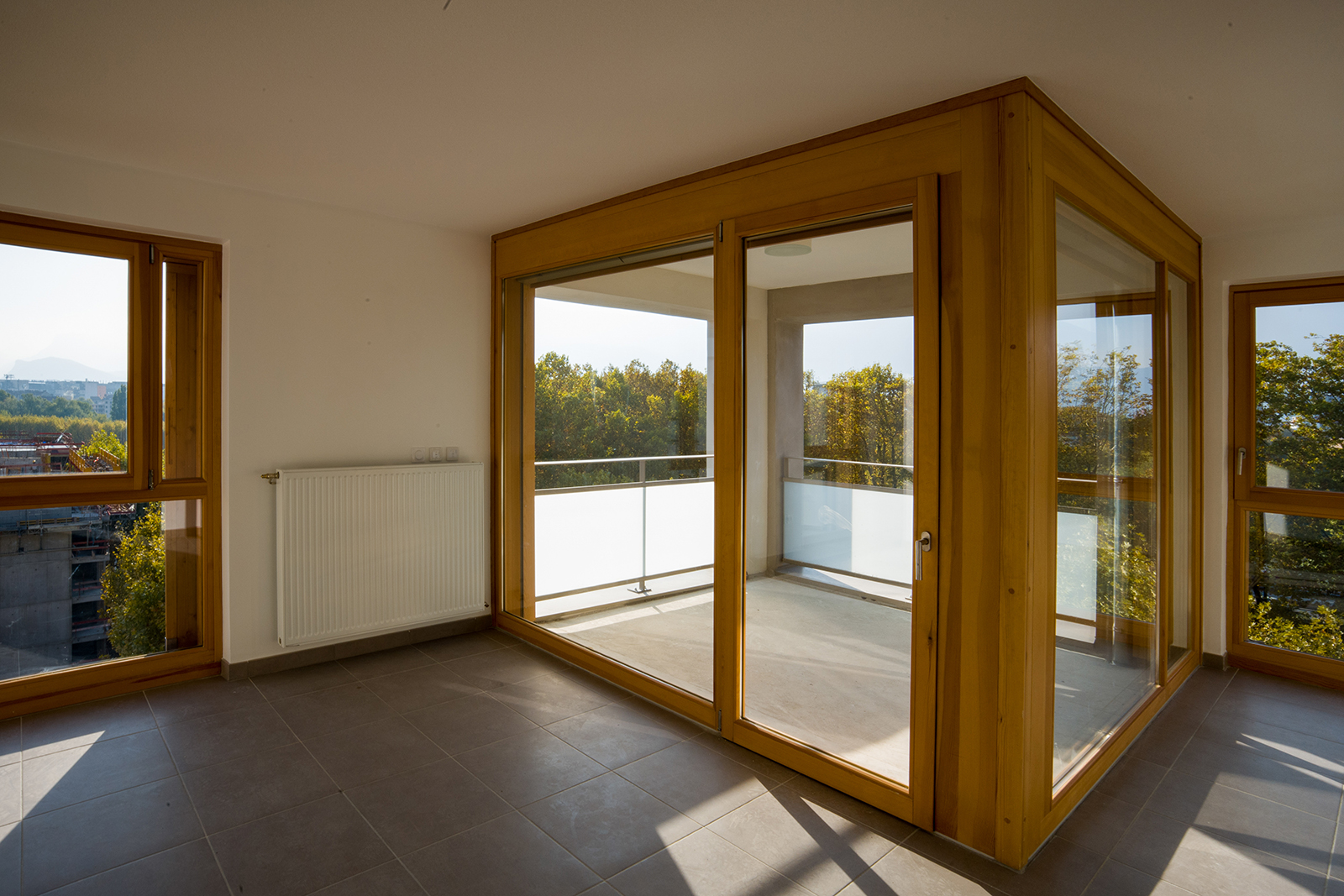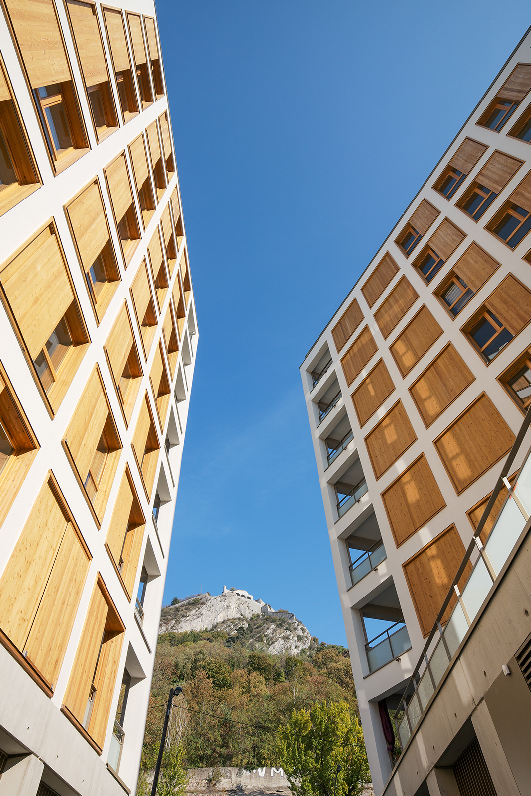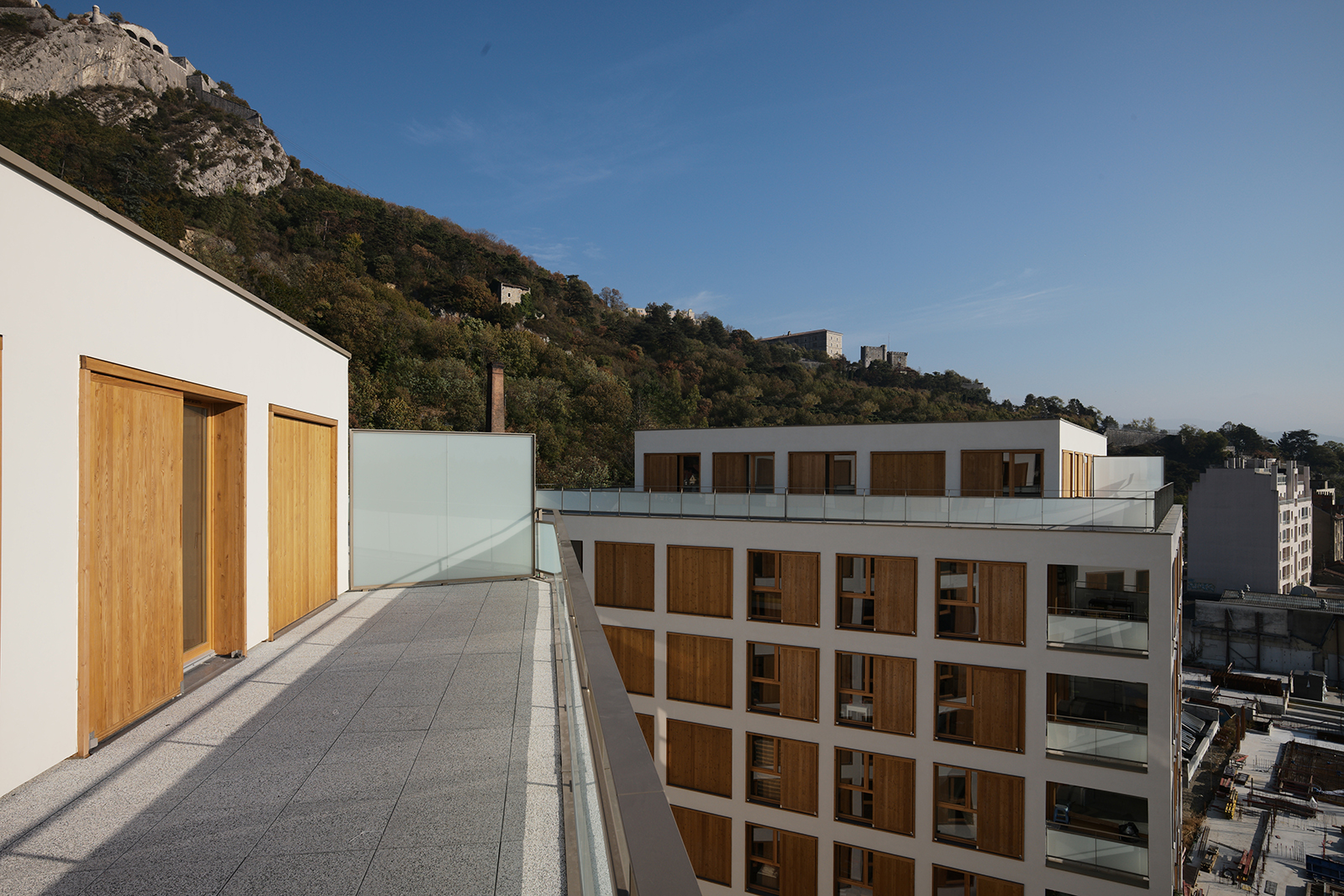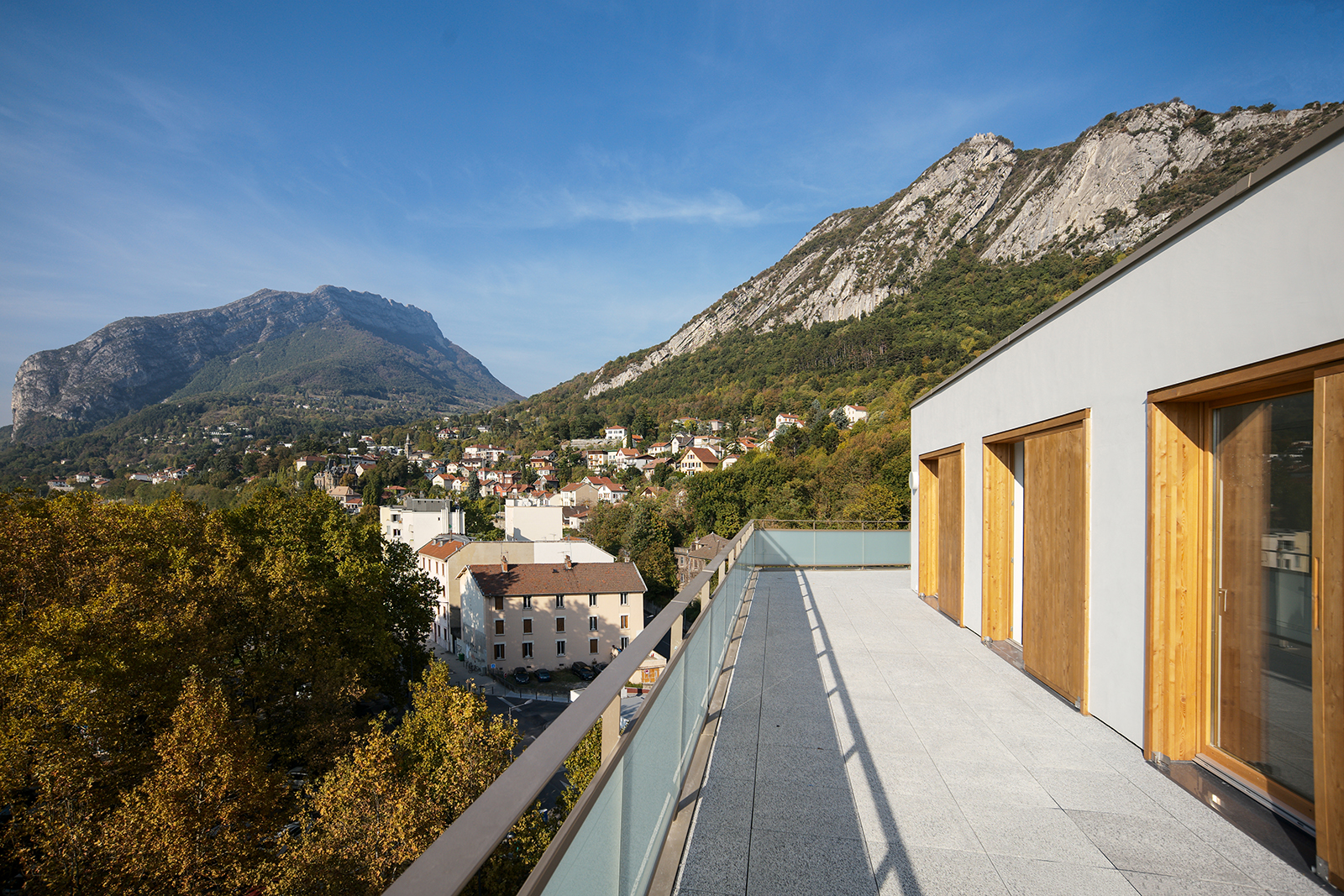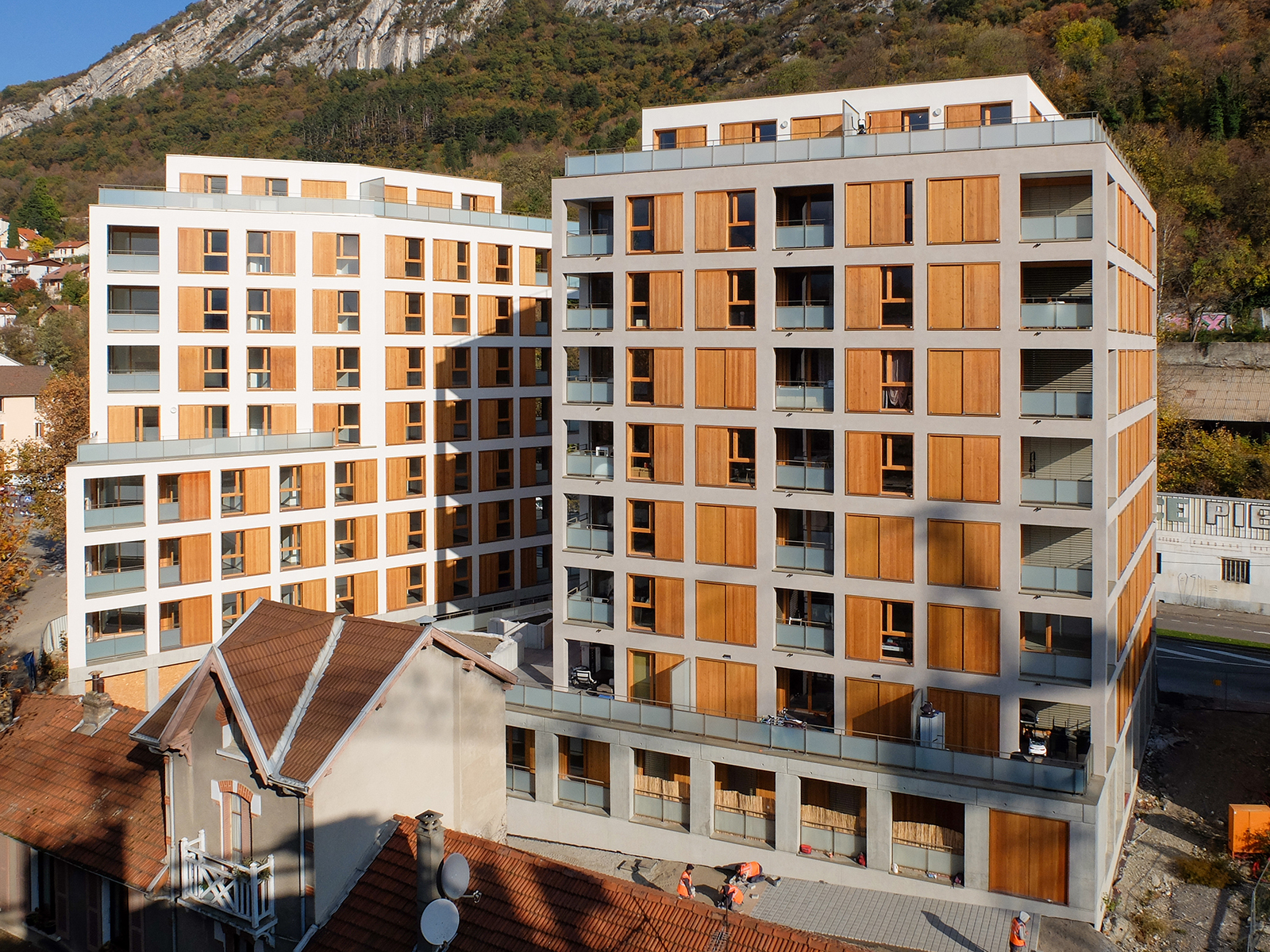 Le quartier de l’Esplanade appartient à la ville de Grenoble depuis le décret présidentiel de 1884 rattachant ce quartier de Saint Martin le Vinoux à la ville. C’est un lieu de transition qui marque l’articulation entre Grenoble et Saint Martin le Vinoux. Au delà de ces images liées à des pratiques et usages, le site est marqué par des éléments naturels forts: l’Isère à l’ouest et au sud, les berges ici très naturelles et dont le tracé est souligné par un alignement d’arbres, la Bastille à l’est, très proche, domine le site de sa masse rocheuse “sauvage”… Le projet articule deux volumes aux volumétries élancées, à R+7 plus attique. Les socles sont conservés en béton brut. Un principe de baie avec menuiserie bois, cadre bois, et volet bois coulissant est décliné sur l’ensemble des façades. Les façades sont revêtues d’un enduit ultra-fin.