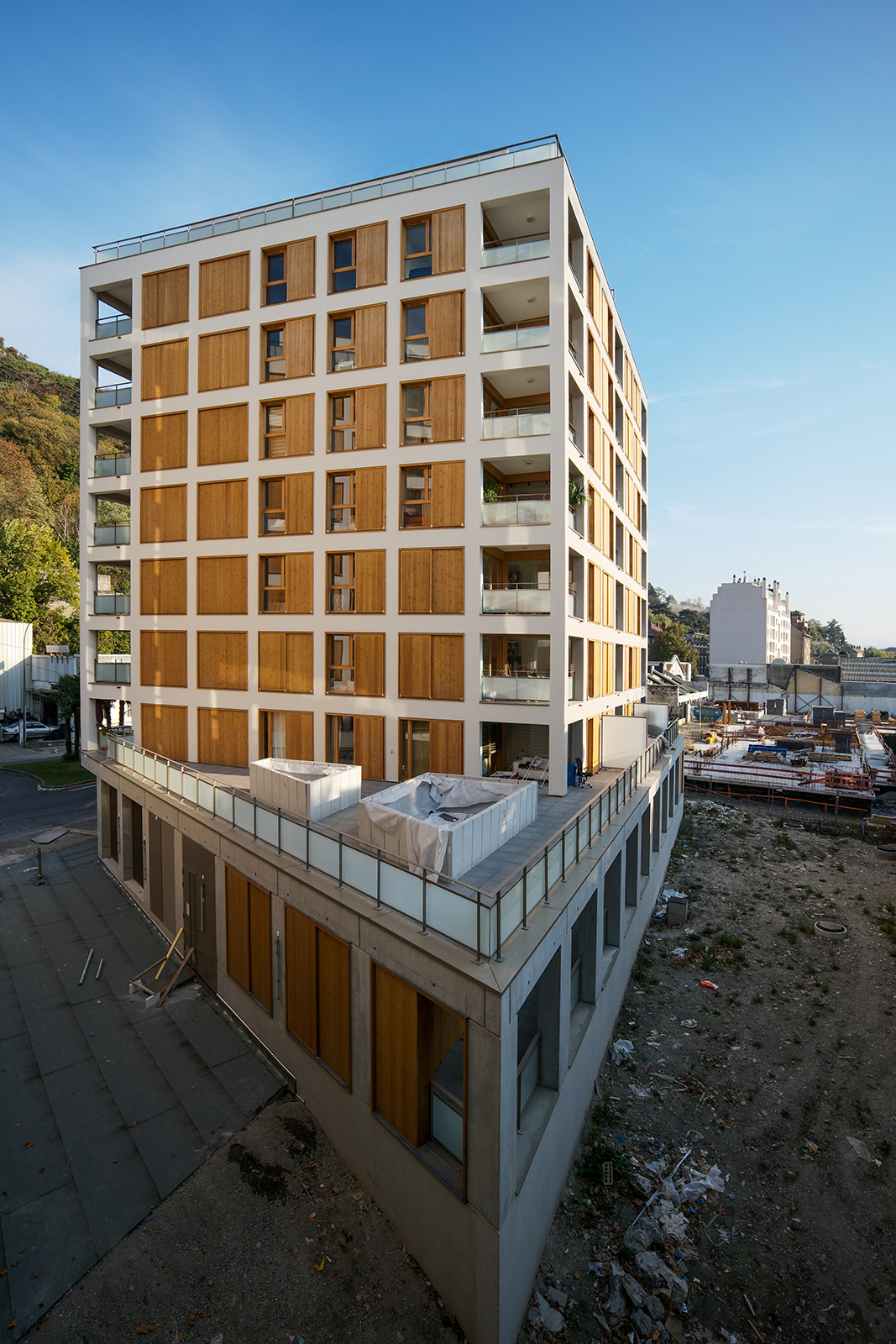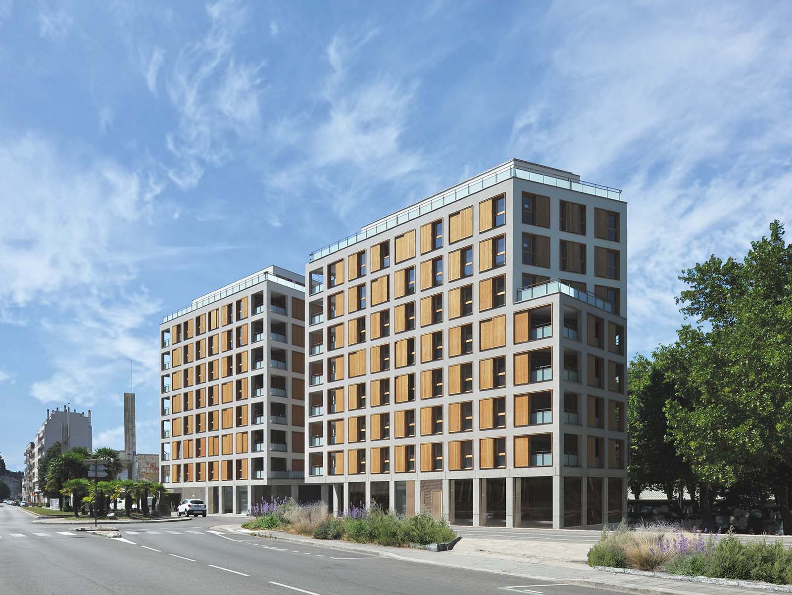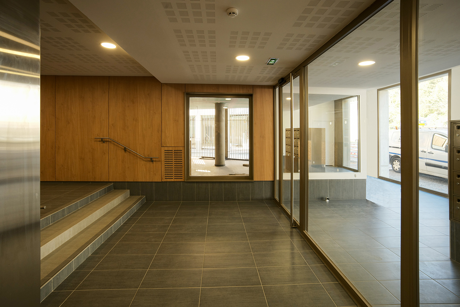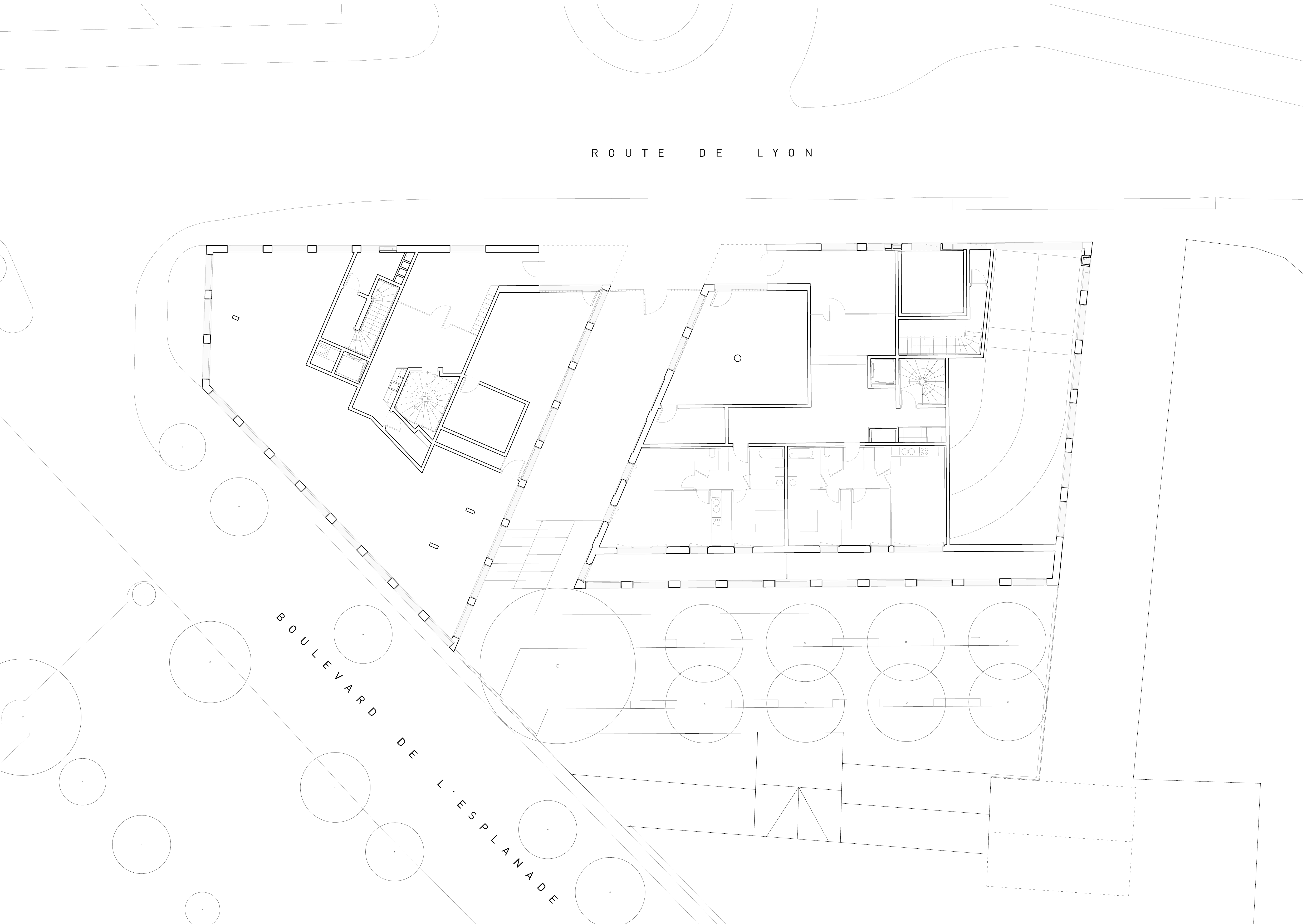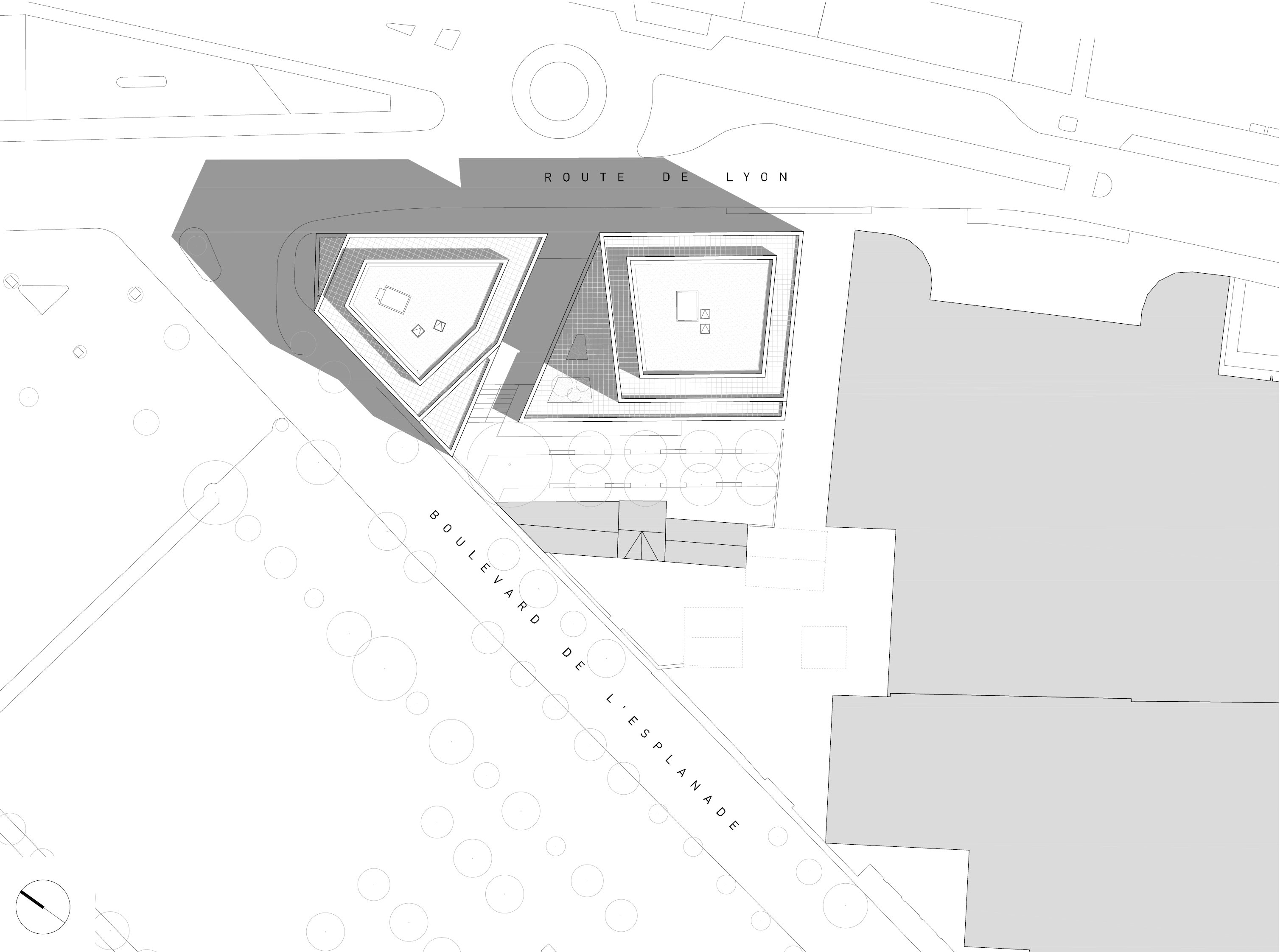 Le quartier de l’Esplanade appartient à la ville de Grenoble depuis le décret présidentiel de 1884 rattachant ce quartier de Saint Martin le Vinoux à la ville. C’est un lieu de transition qui marque l’articulation entre Grenoble et Saint Martin le Vinoux. Au delà de ces images liées à des pratiques et usages, le site est marqué par des éléments naturels forts: l’Isère à l’ouest et au sud, les berges ici très naturelles et dont le tracé est souligné par un alignement d’arbres, la Bastille à l’est, très proche, domine le site de sa masse rocheuse “sauvage”… Le projet articule deux volumes aux volumétries élancées, à R+7 plus attique. Les socles sont conservés en béton brut. Un principe de baie avec menuiserie bois, cadre bois, et volet bois coulissant est décliné sur l’ensemble des façades. Les façades sont revêtues d’un enduit ultra-fin.