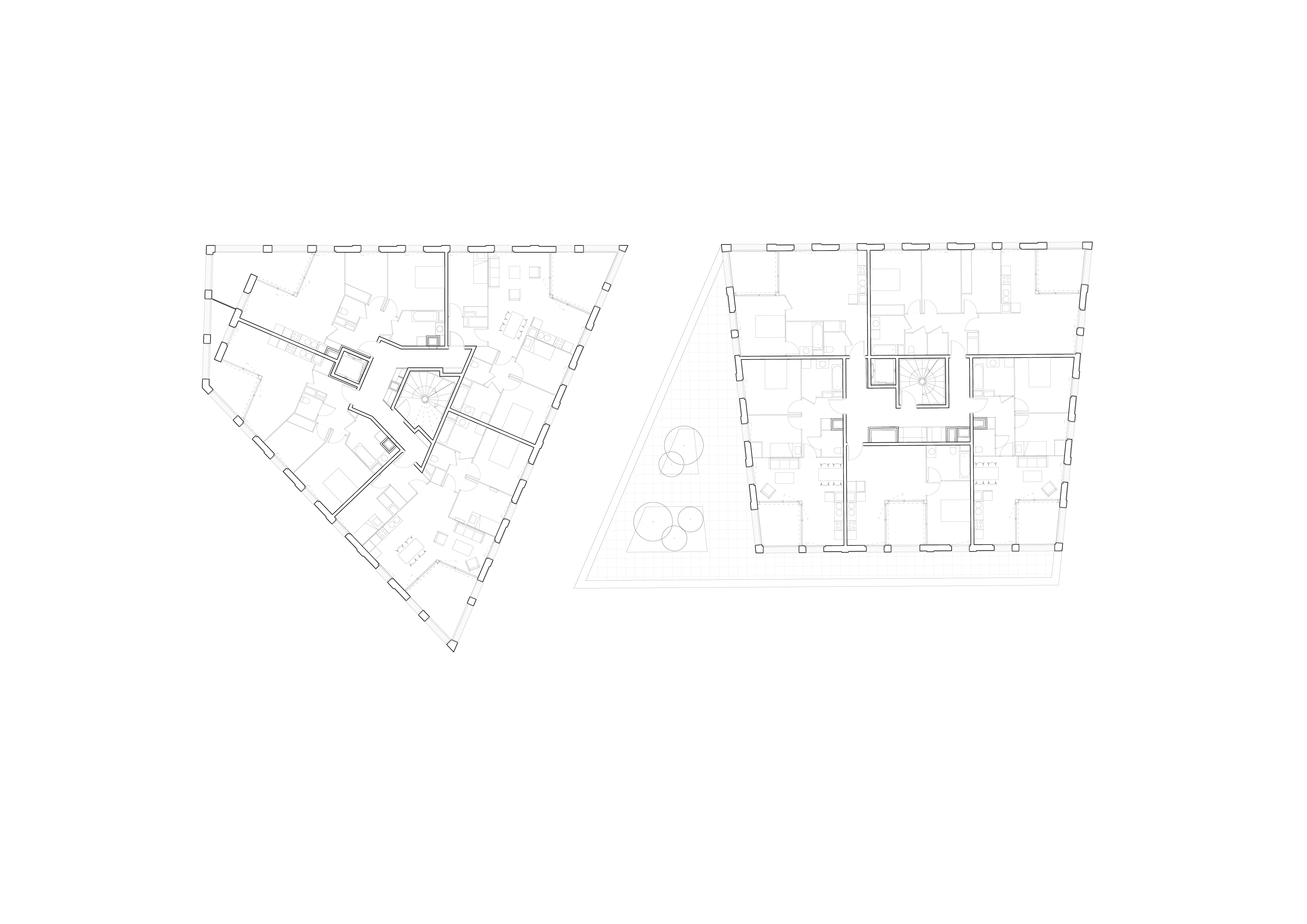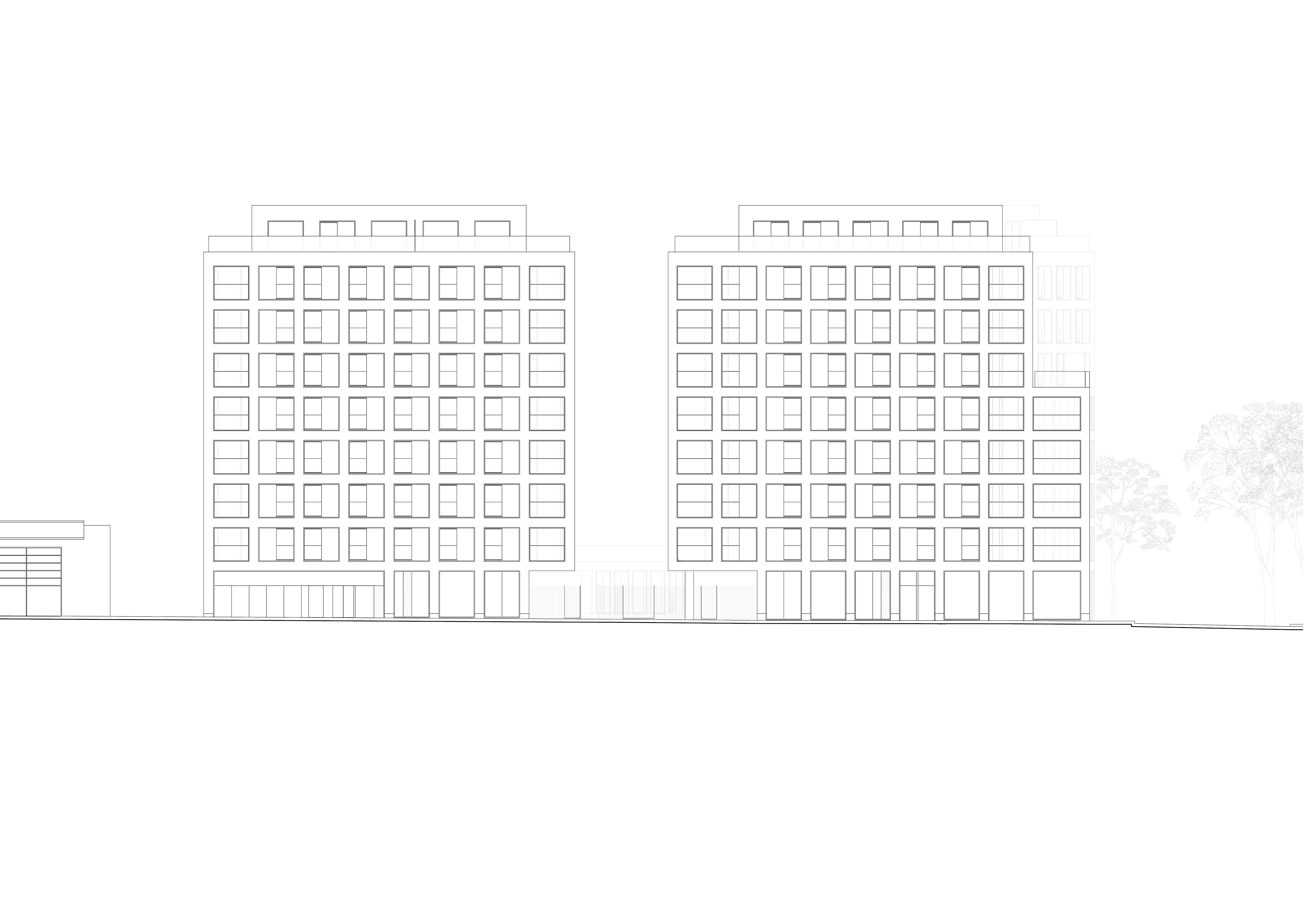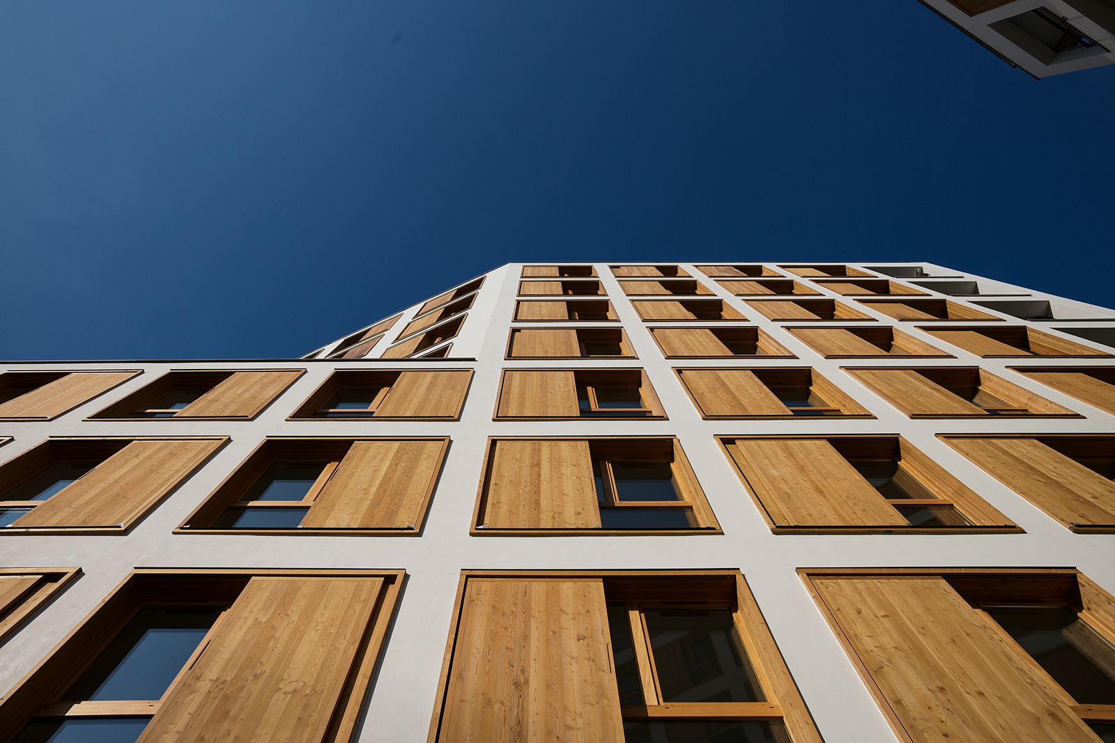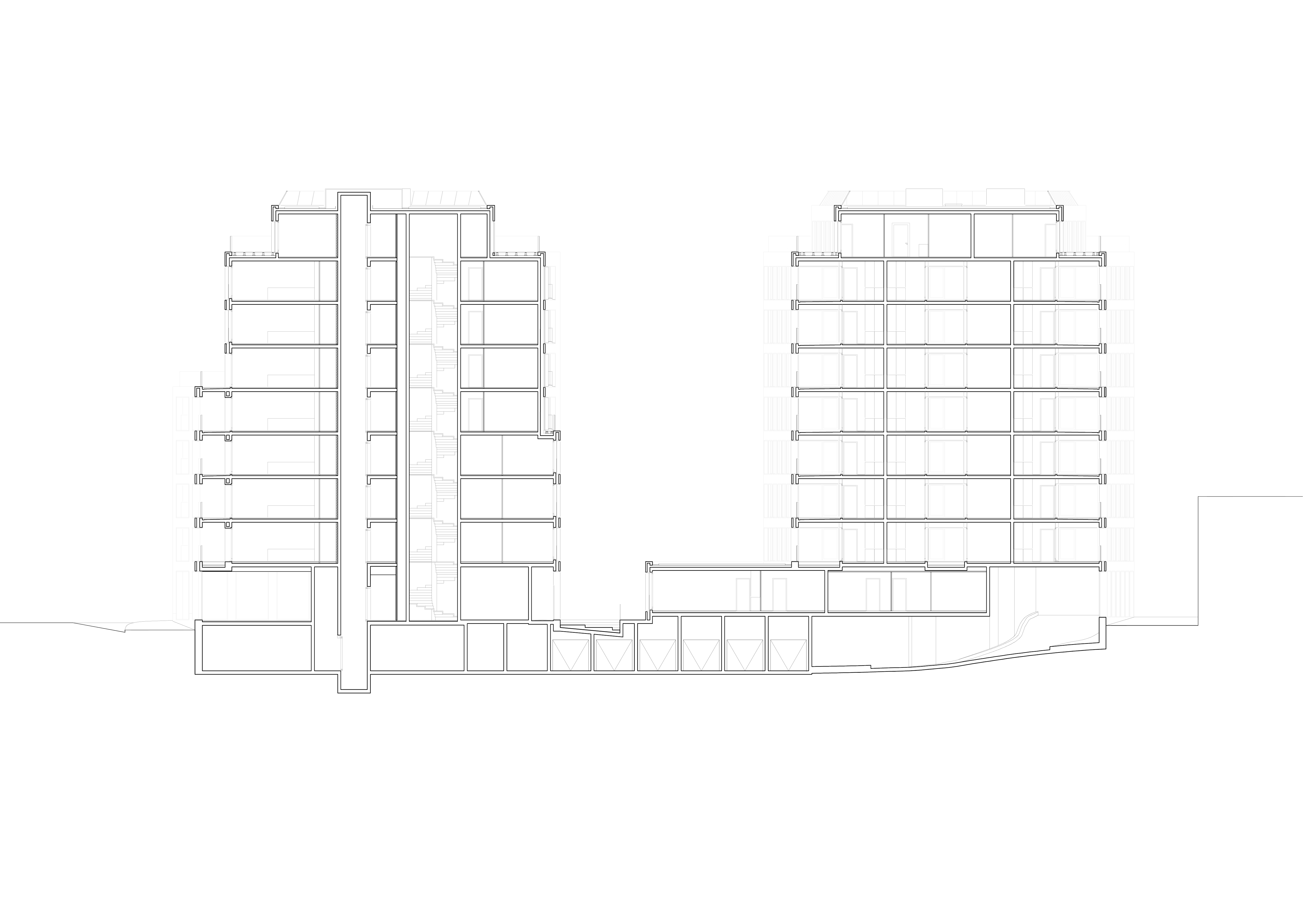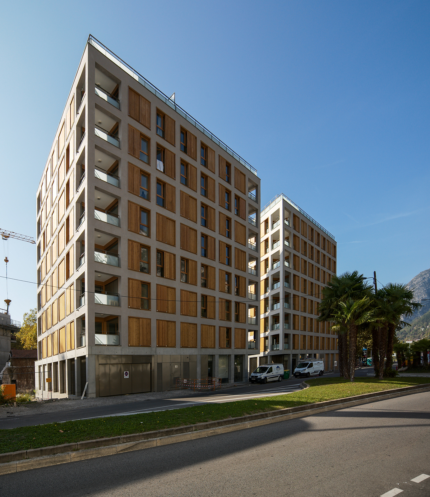 Le quartier de l’Esplanade appartient à la ville de Grenoble depuis le décret présidentiel de 1884 rattachant ce quartier de Saint Martin le Vinoux à la ville. C’est un lieu de transition qui marque l’articulation entre Grenoble et Saint Martin le Vinoux. Au delà de ces images liées à des pratiques et usages, le site est marqué par des éléments naturels forts: l’Isère à l’ouest et au sud, les berges ici très naturelles et dont le tracé est souligné par un alignement d’arbres, la Bastille à l’est, très proche, domine le site de sa masse rocheuse “sauvage”… Le projet articule deux volumes aux volumétries élancées, à R+7 plus attique. Les socles sont conservés en béton brut. Un principe de baie avec menuiserie bois, cadre bois, et volet bois coulissant est décliné sur l’ensemble des façades. Les façades sont revêtues d’un enduit ultra-fin.