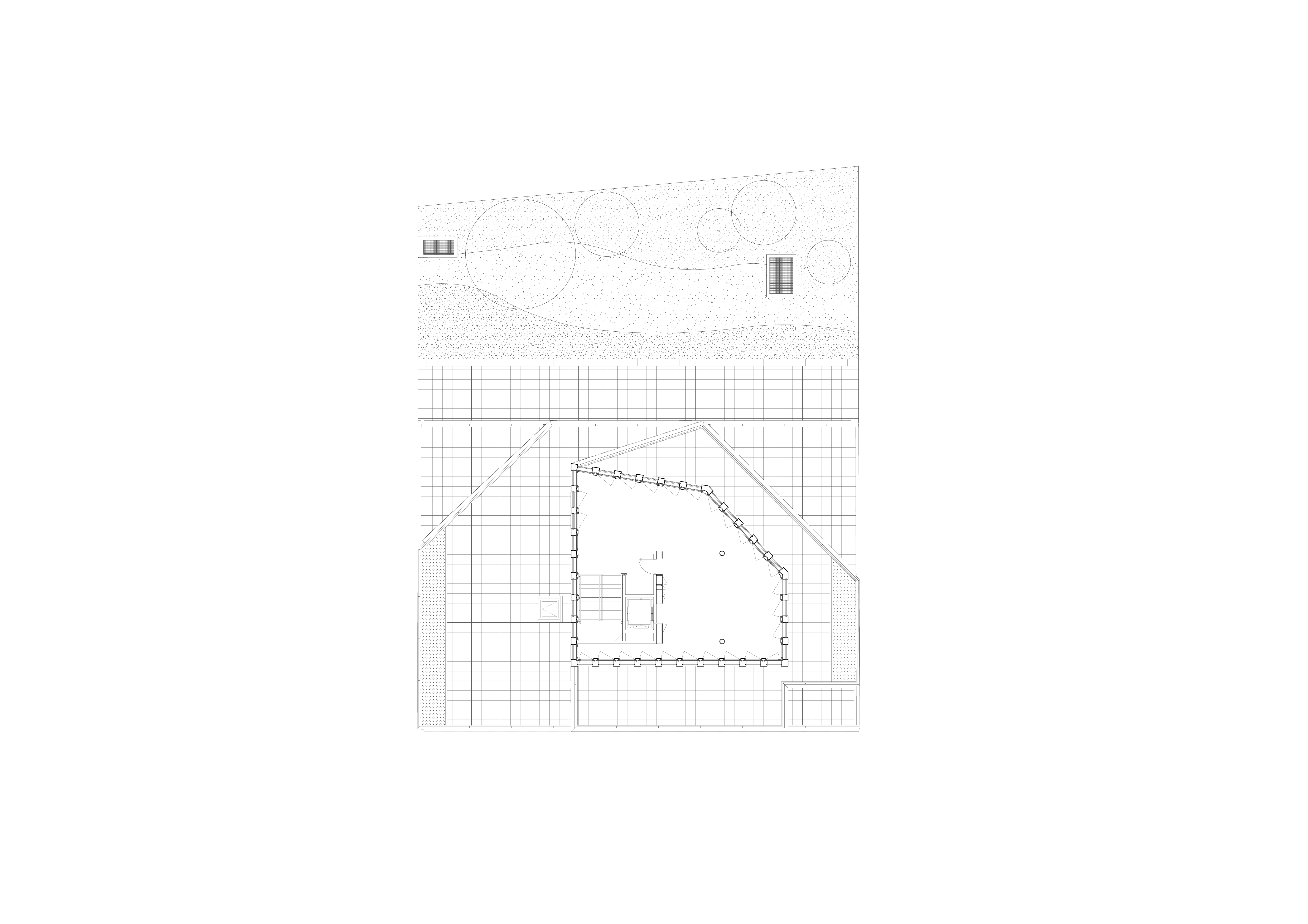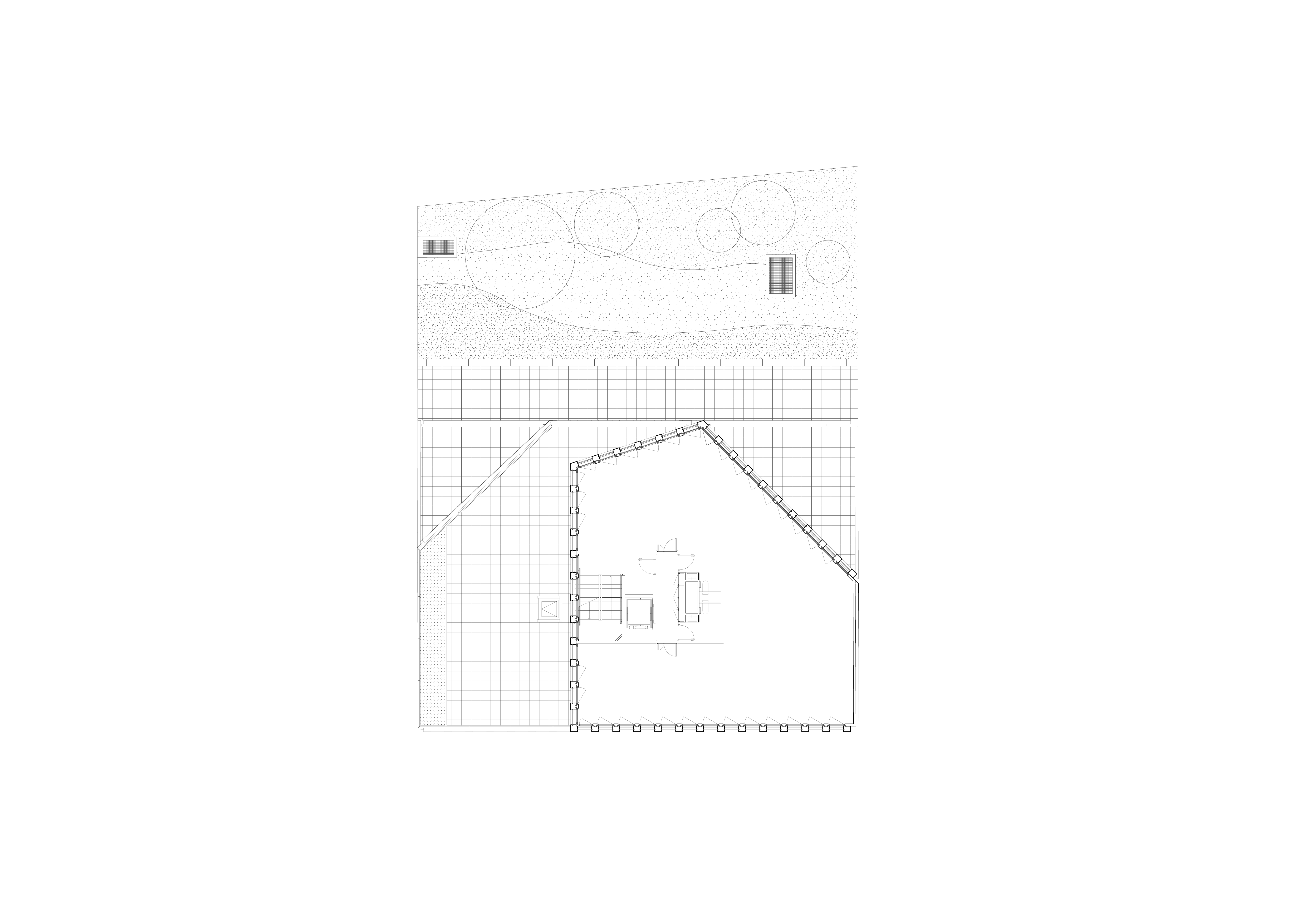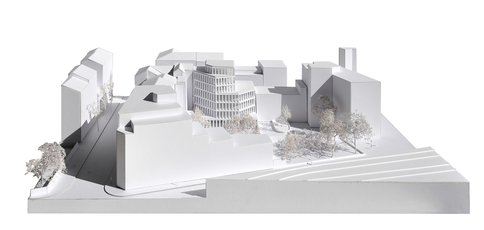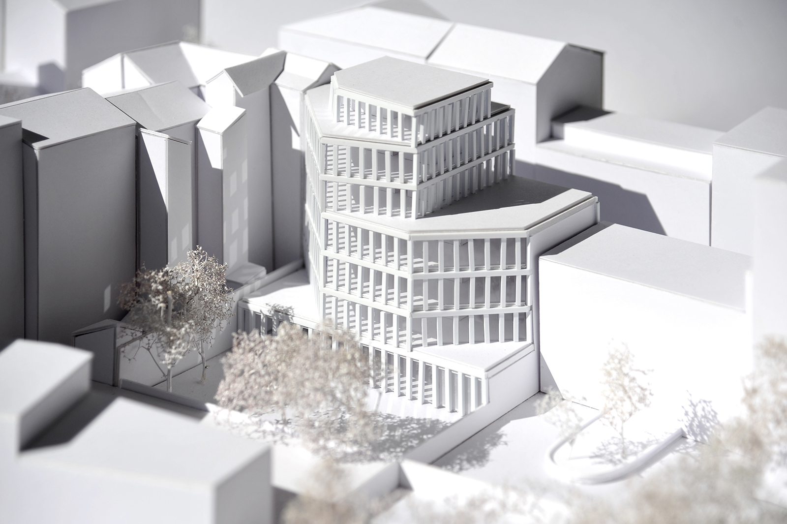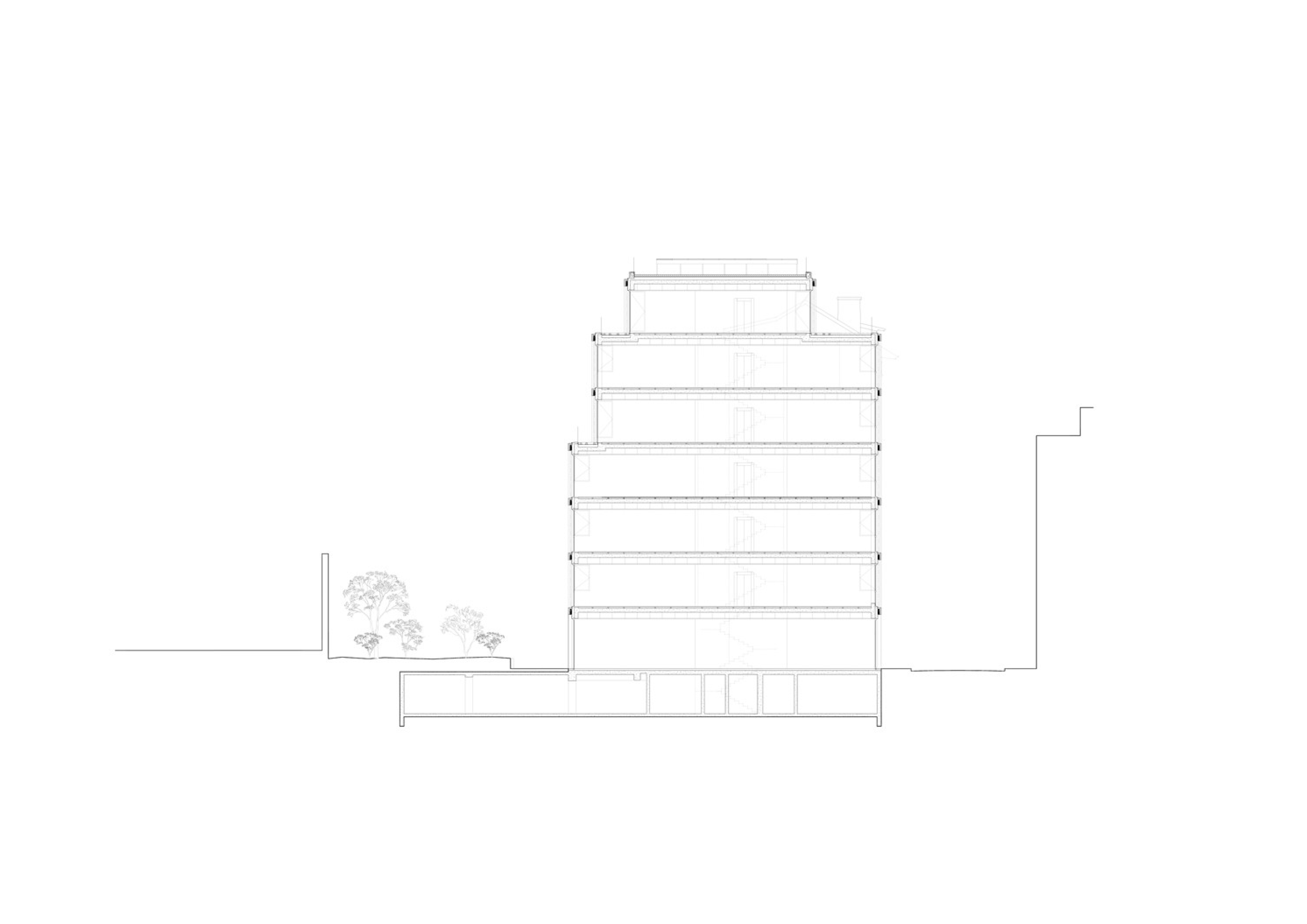 A l’Ouest un jeu de volume par décalages successifs de façades a été opéré respectant la règle suivante : chaque niveau supérieur conserve au moins une continuité de façade avec le niveau inférieur à l’Ouest ou au Sud. Ainsi, dans sa progression verticale, le bâtiment s’allège sans rupture par décalages successifs.