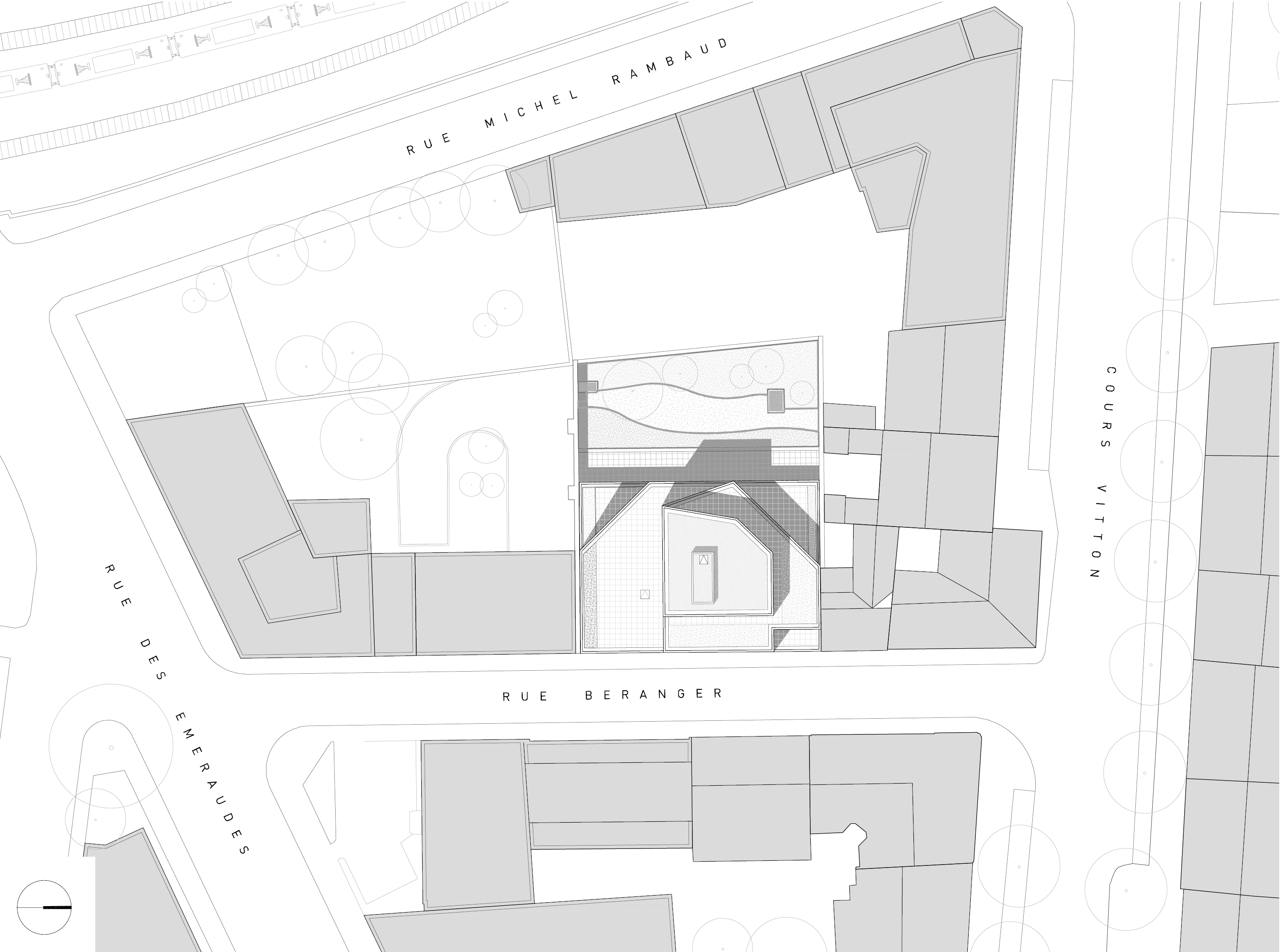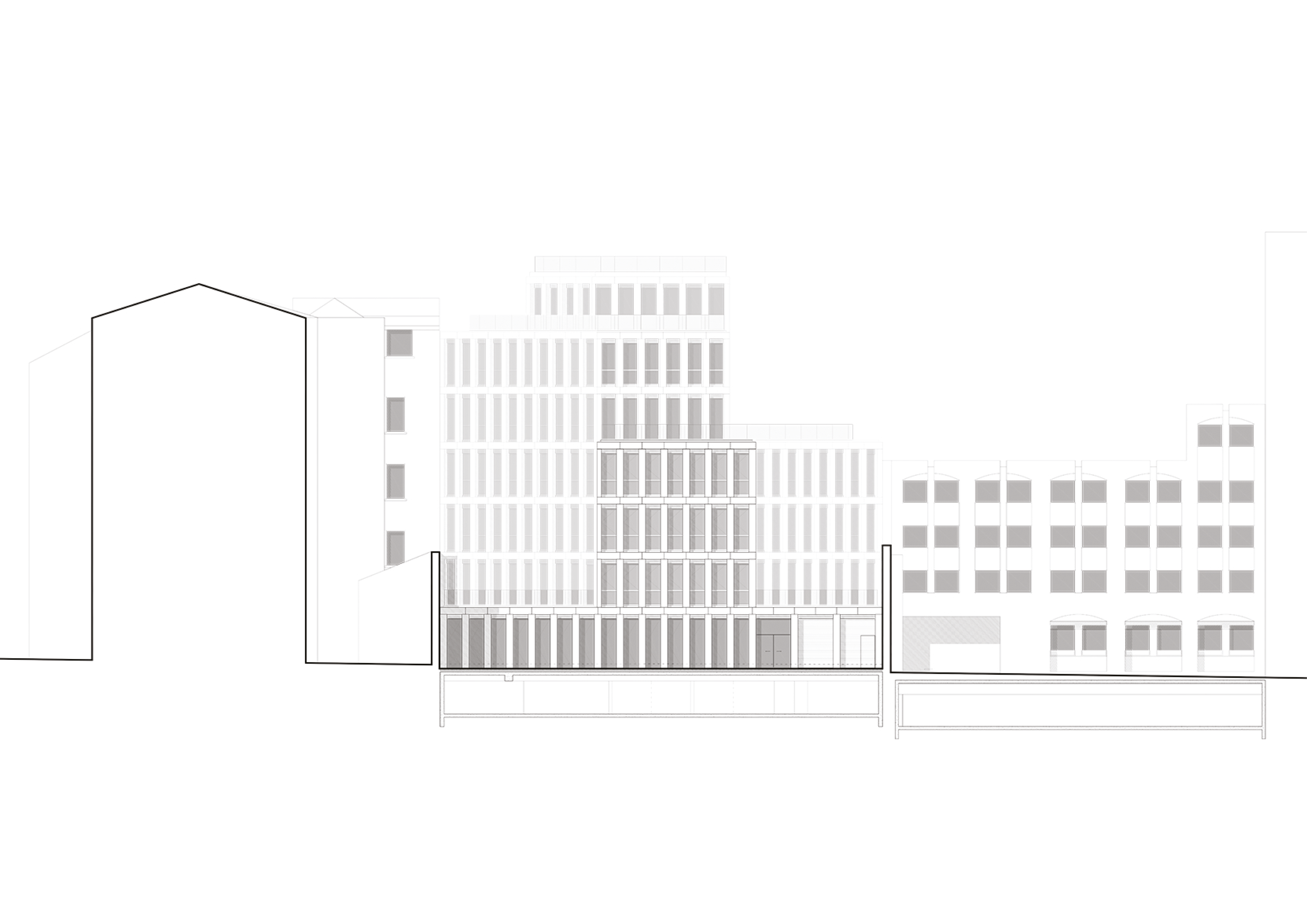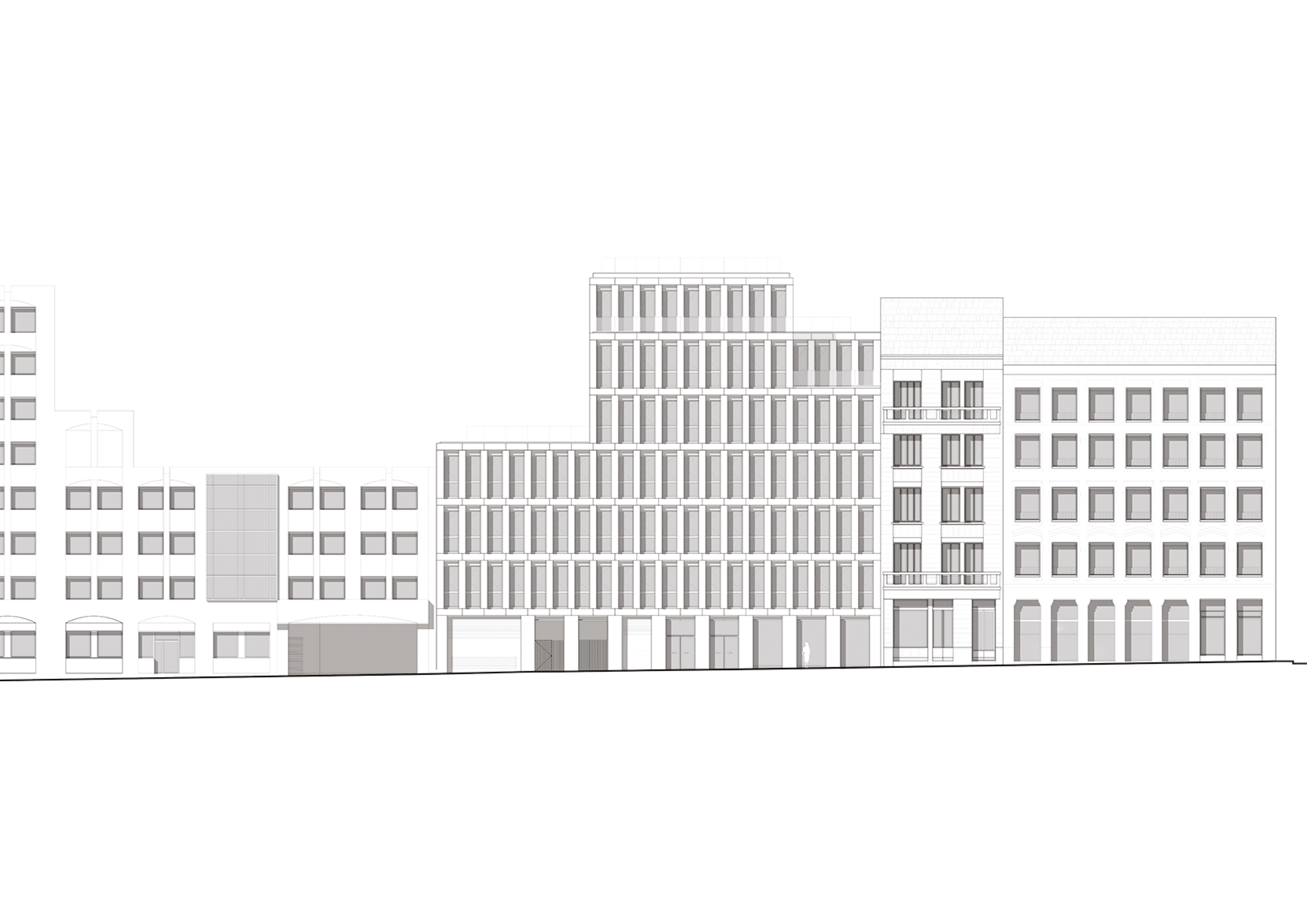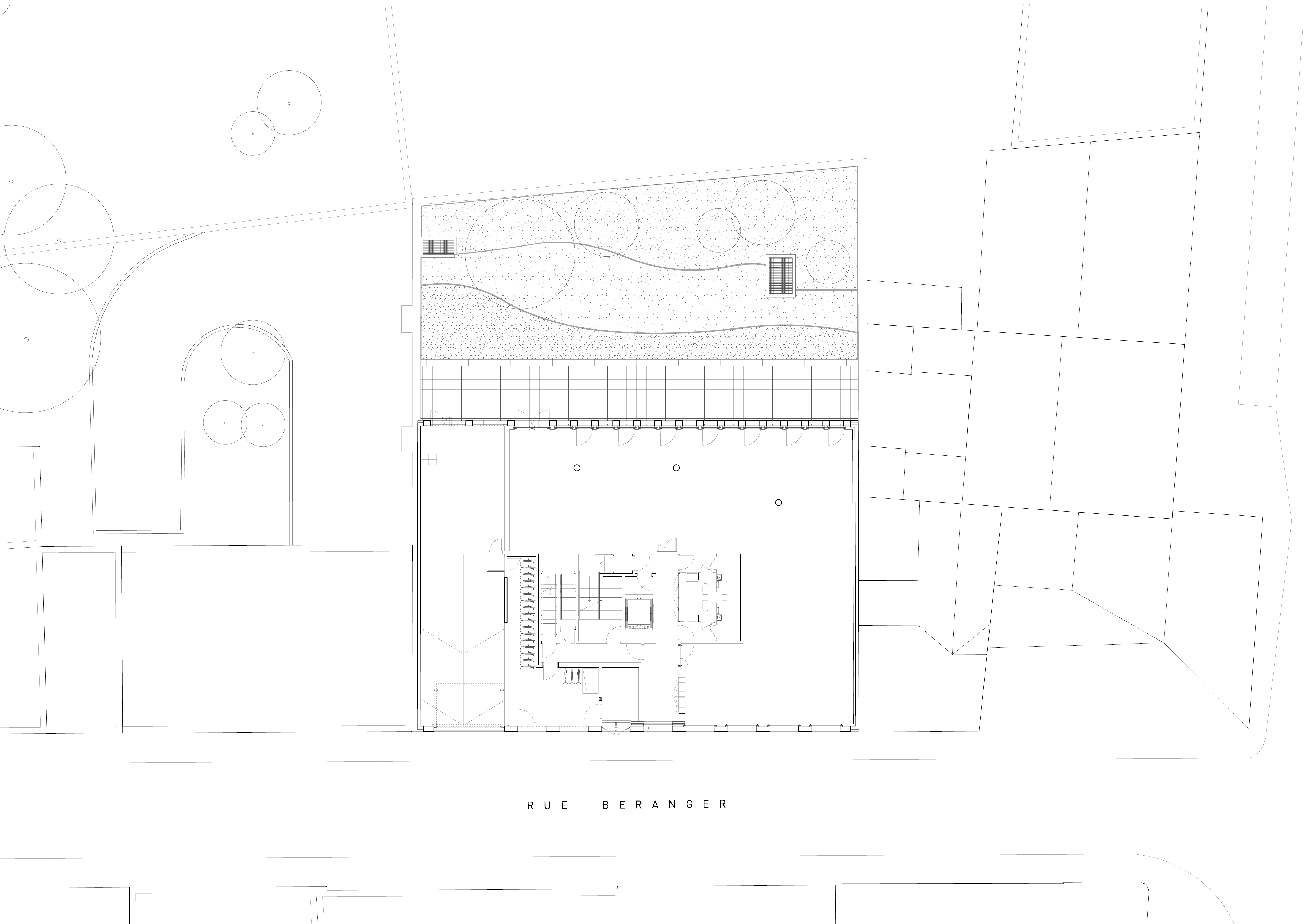 En parcourant la rue Béranger, le projet s’insère dans la continuité du front bâti du pignon en limite nord jusqu’au pignon d’un bâtiment de bureaux en limite Sud. Une grande attention a été portée sur l’accroche avec les pignons voisins. Ainsi, la hauteur du bâtiment projeté a été définie afin que ce dernier ne dépasse pas la toiture voisine côté Ouest. Dans le même esprit, une terrasse au R+5 à l’Est permet un retrait vis-à-vis de l’avoisinant et une bonne accroche contre son pignon.
