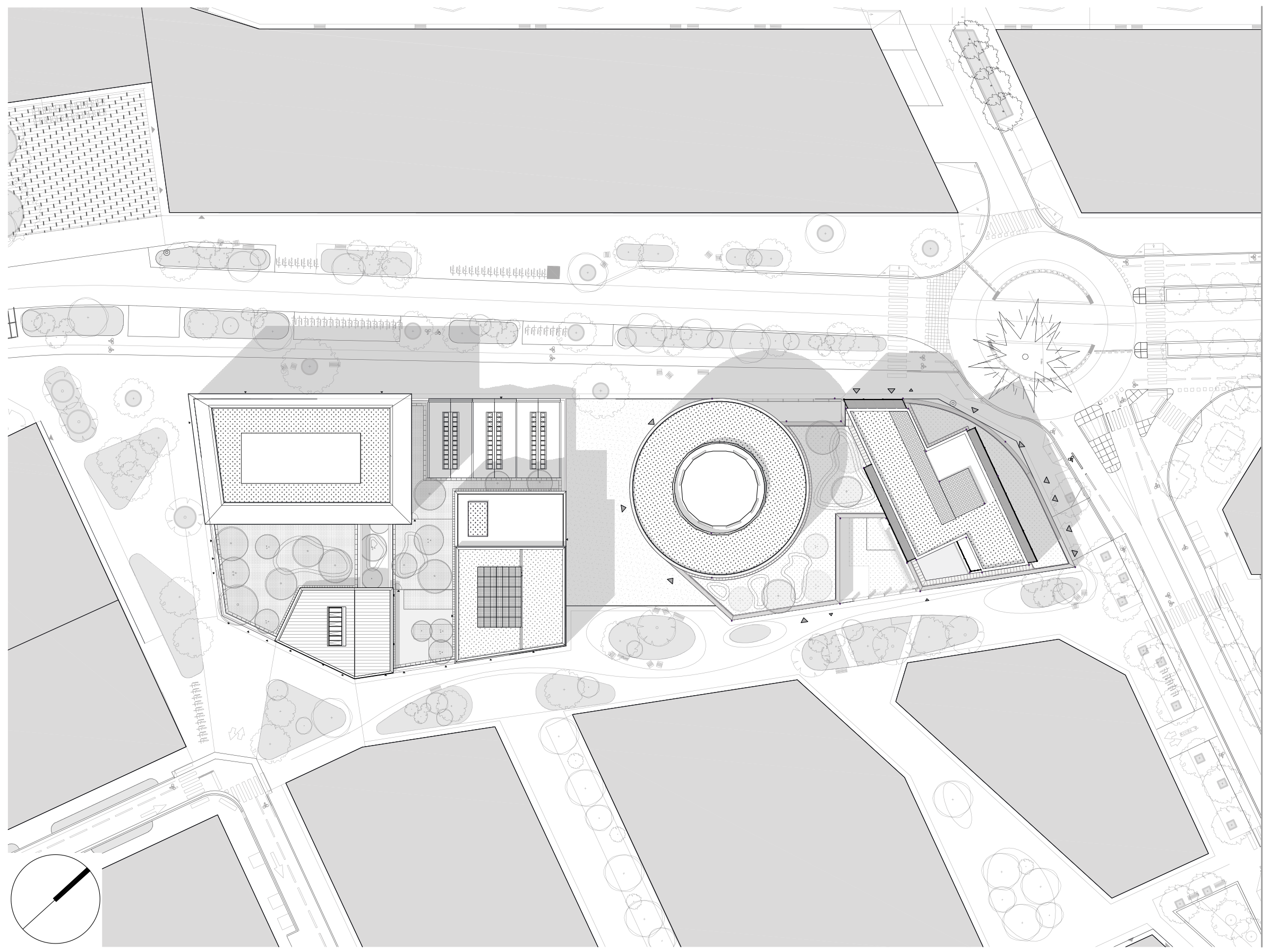 Architecturalement parlant, ce volume horizontal au sol n’est pas vraiment un socle. Très ouvert et vitré, il ne « porte » pas les cinq émergences bâties verticales qui le surplombent. Il les accompagne plutôt dans leur relation au sol ou s’immisce entre elles.