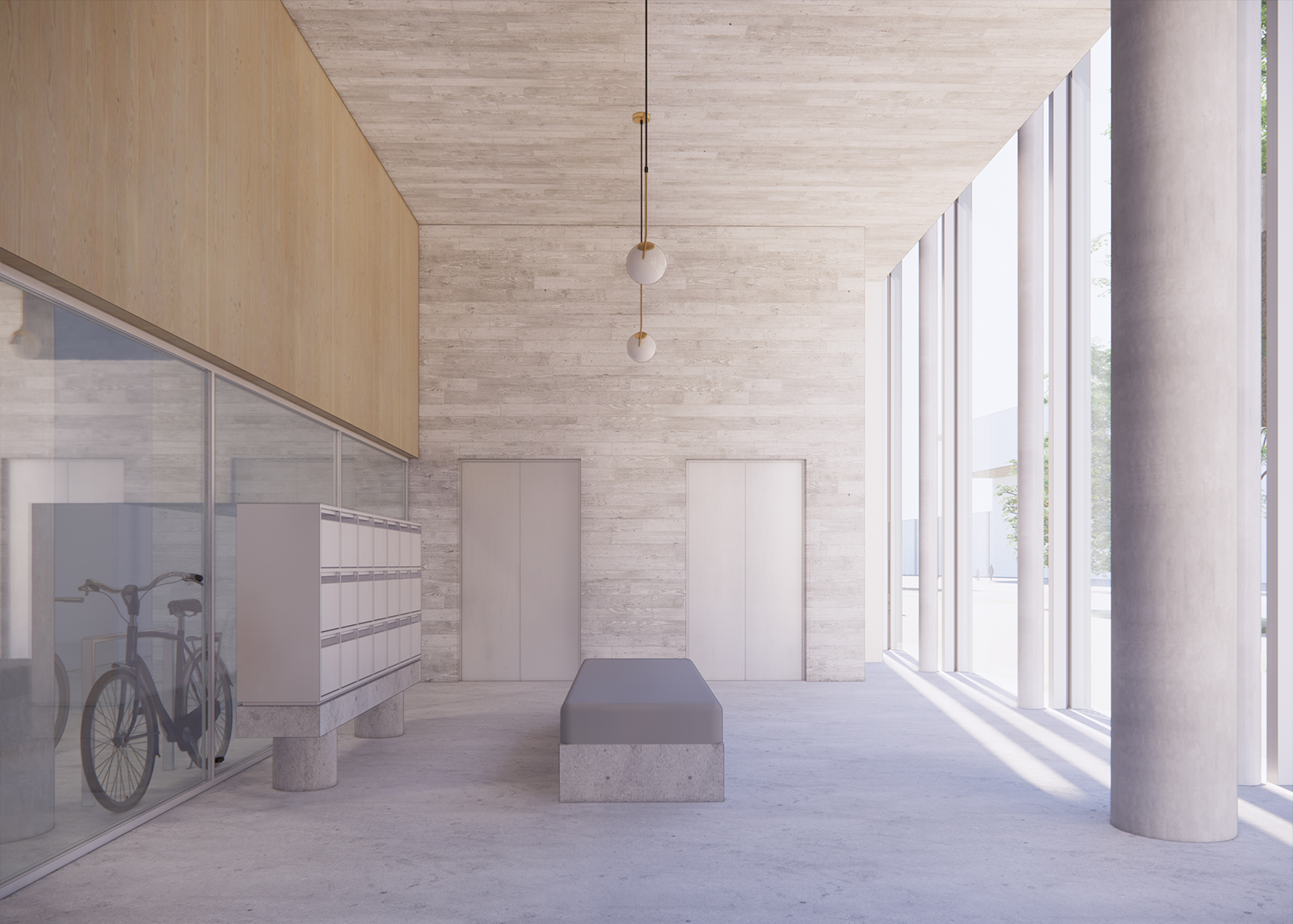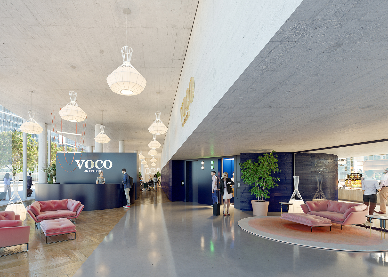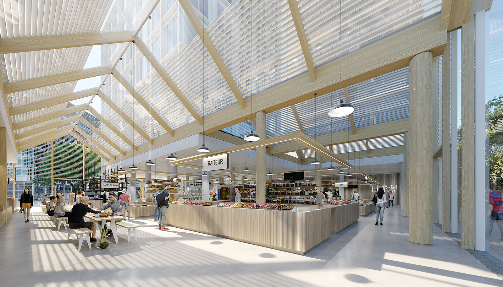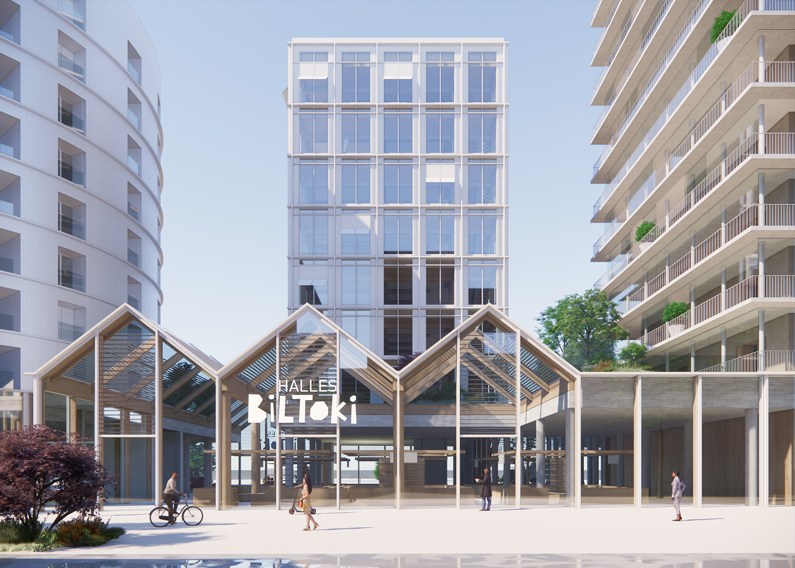 Hyper actif et occupant toute la parcelle de l’ilot, le « socle » du projet comprend la grande halle BILTOKI, le lobby, le lounge-bar et la salle de petits-déjeuners de l’hôtel VOCO, deux grands commerces non prévus au programme, une partie de la Maison de Santé, les halls et locaux vélos de toutes les parties du programme, et les deux ensembles d’accès au parc de stationnement.
