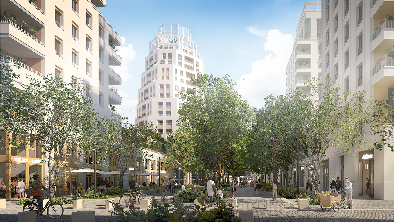Les rez-de-chaussée hauts et sur deux niveaux constitueront le socle actif du projet urbain et accueilleront les halls, des commerces, des services, parfois quelques logements, des locaux vélos et des parcs de stationnement intégrés.