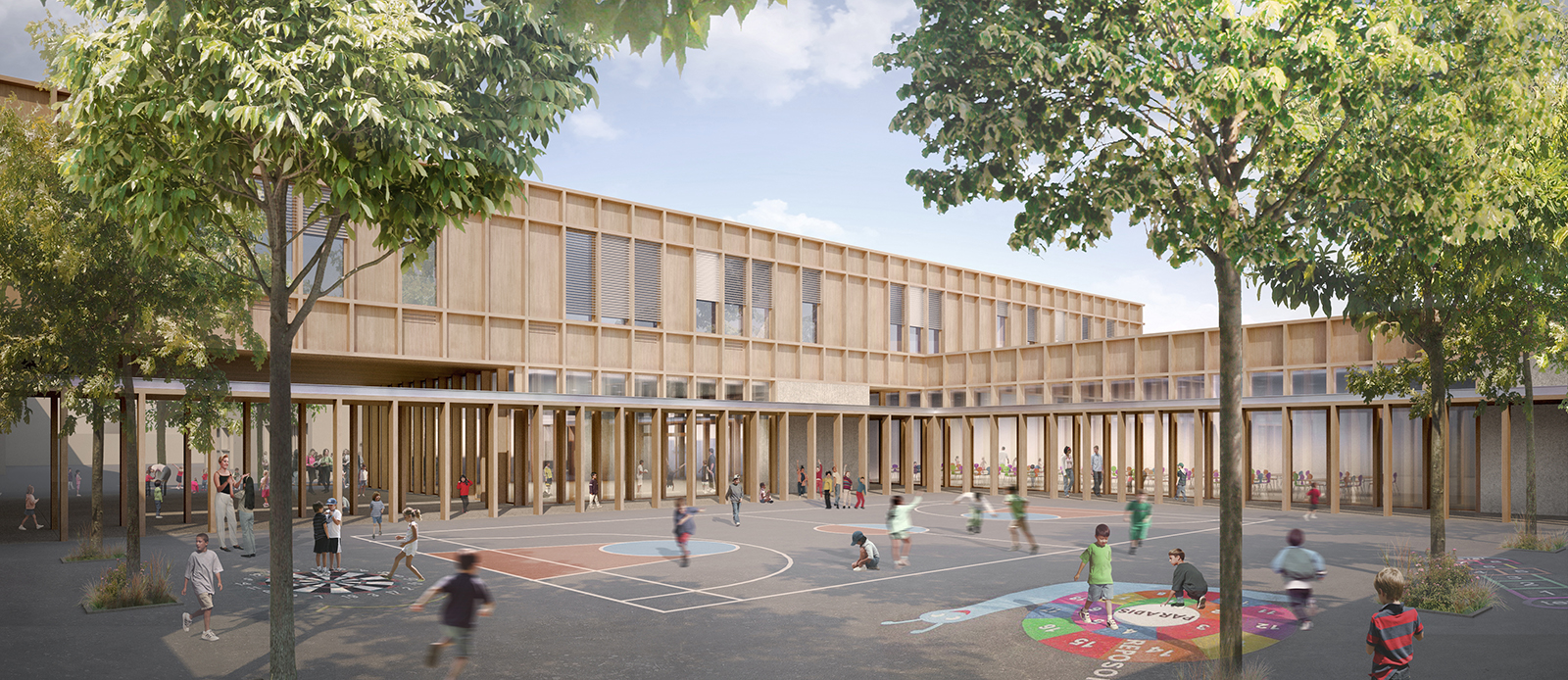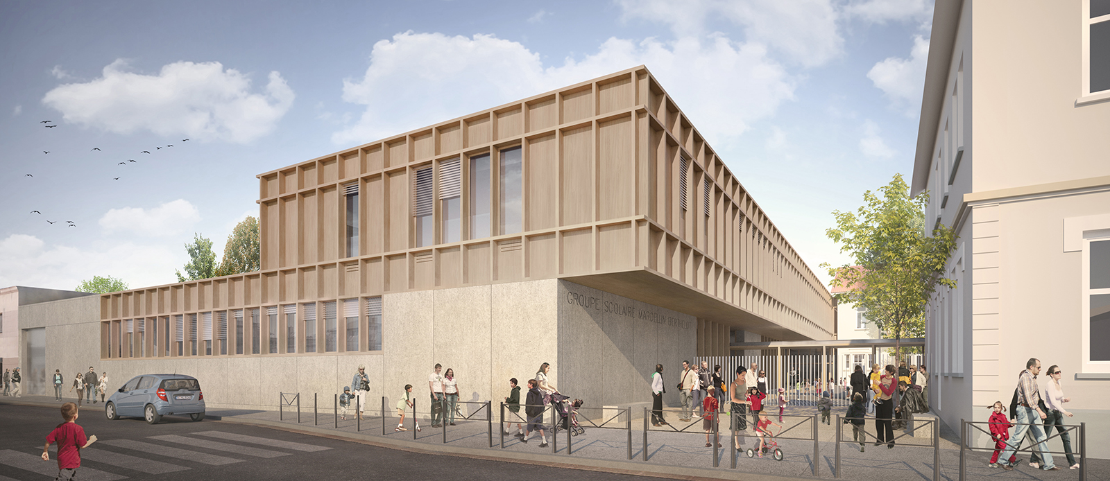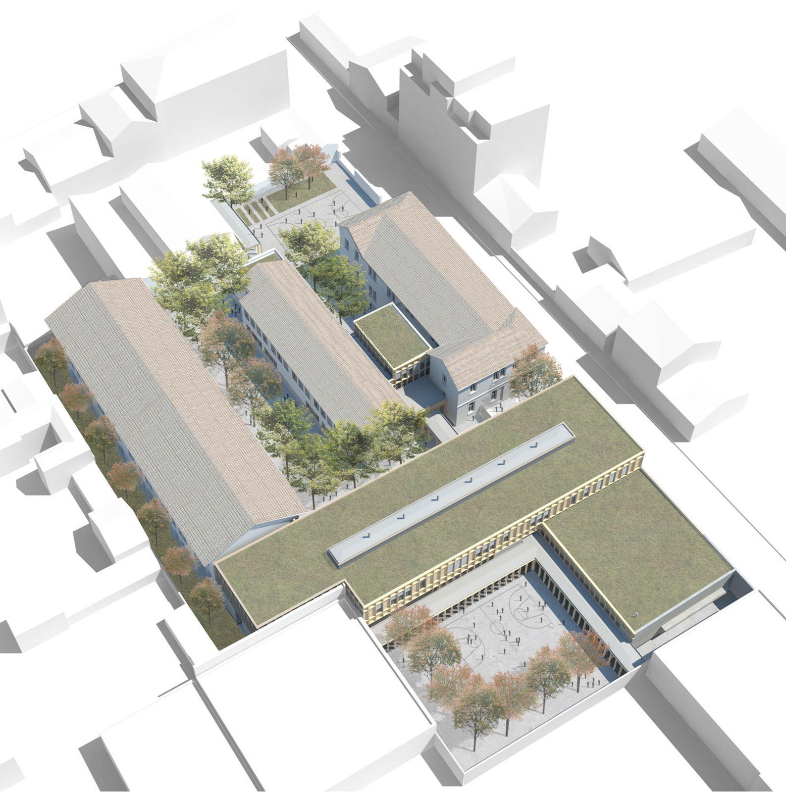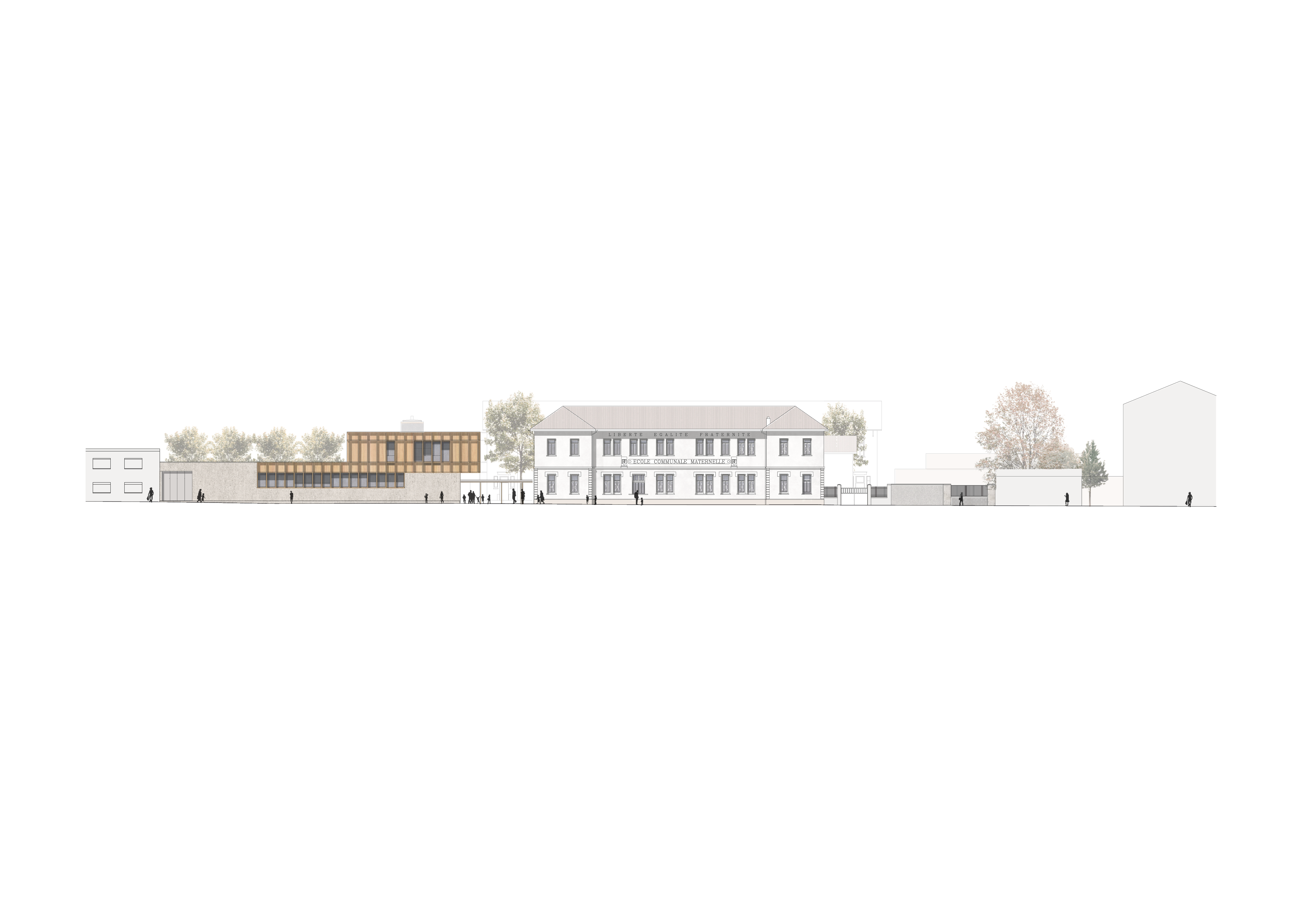 Le traitement architectural des bâtiments neufs découle de plusieurs volontés. Il ne s’agit certainement pas de « singer » les bâtiments existants mais plutôt d’utiliser les constructions neuves pour créer un « écrin » de mise en valeur de ceux-ci. Le positionnement du bâtiment principal perpendiculairement aux existants, outre les avantages fonctionnels immédiats vient mettre en tension le neuf et l’existant pour créer une véritable allée de desserte principale ente les deux et favoriser la pérennité de cette zone. Cependant son traitement architectonique (béton préfabriqué désactivé sur la rue et système bois tramé pour le reste) se veut le plus neutre possible de manière à ne pas créer de déséquilibre. Ceci se traduit par une succession de meneaux bois qui enserrent soit un élément vitré ouvrant ou non, soit un panneau de bois massif. Le rythme vertical généré répond discrètement aux baies des bâtiments existant (hors annexe de la maternelle) et « joue » avec le volume très linéaire du bâtiment neuf. La majeure partie des bâtiments neufs pourra être préfabriquée en atelier. Ce principe possède bien sur l’avantage de proposer un chantier propre, débarrassé au maximum de ses nuisances sonores et olfactives mais aussi d’en garantir la rapidité d’exécution. Ce travail en atelier permet également des assemblages de meilleure qualité générale et le contrôle des points essentiels tel que la liaison menuiseries-enveloppe pour en garantir l’étanchéité à l’air. Les bois utilisés seront traités et composés essentiellement de douglas et mélèze.