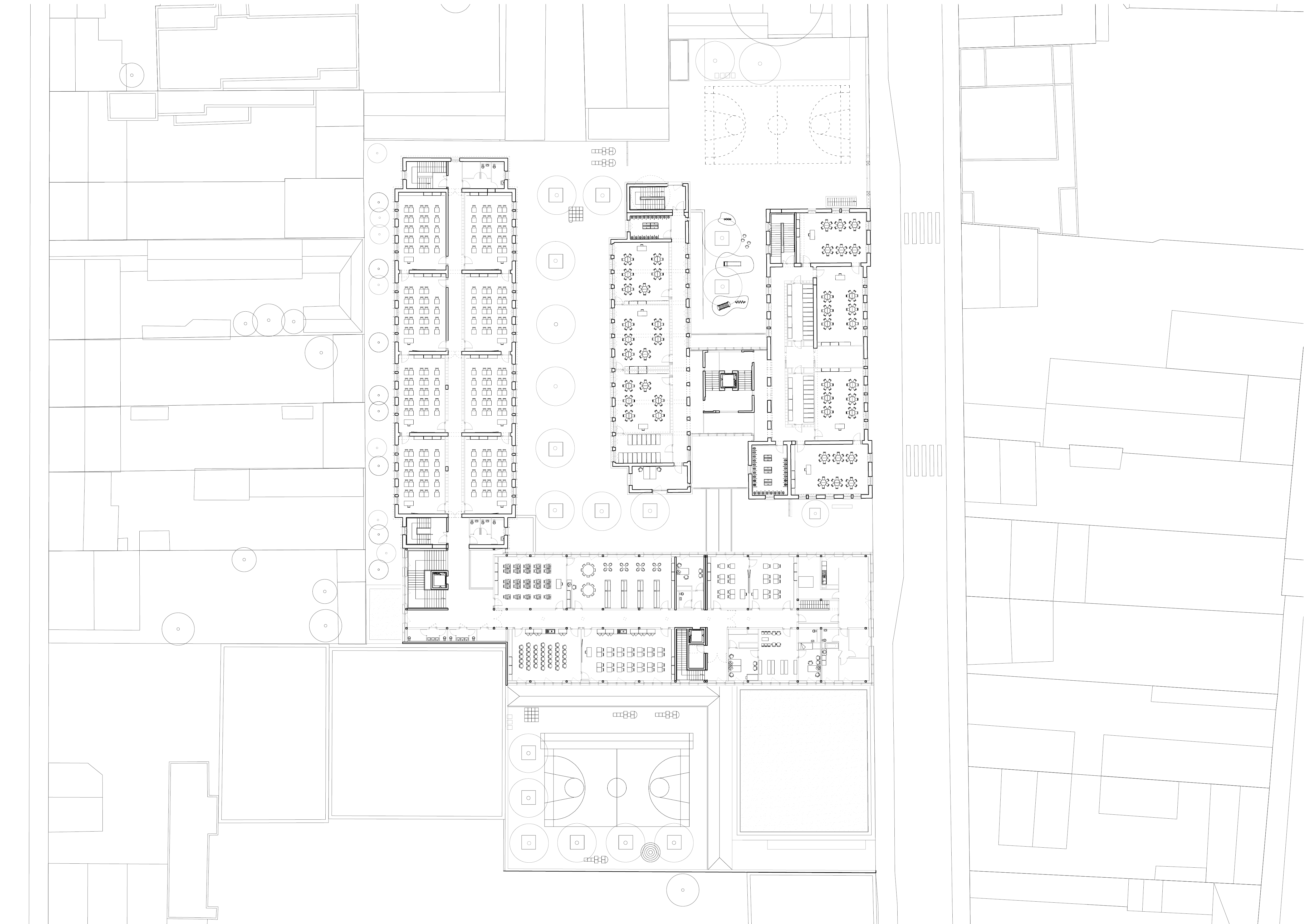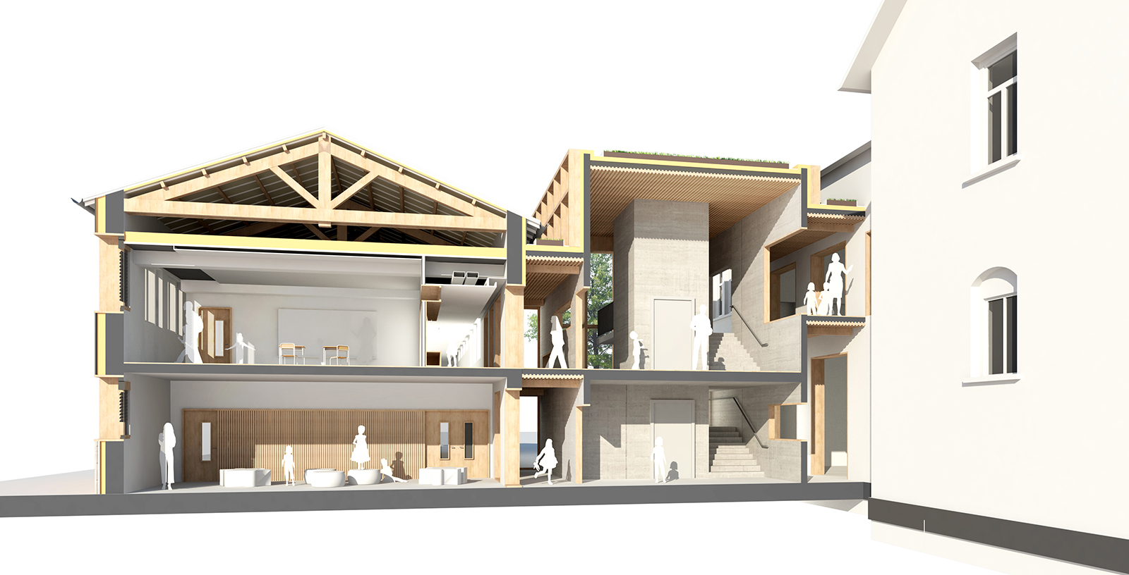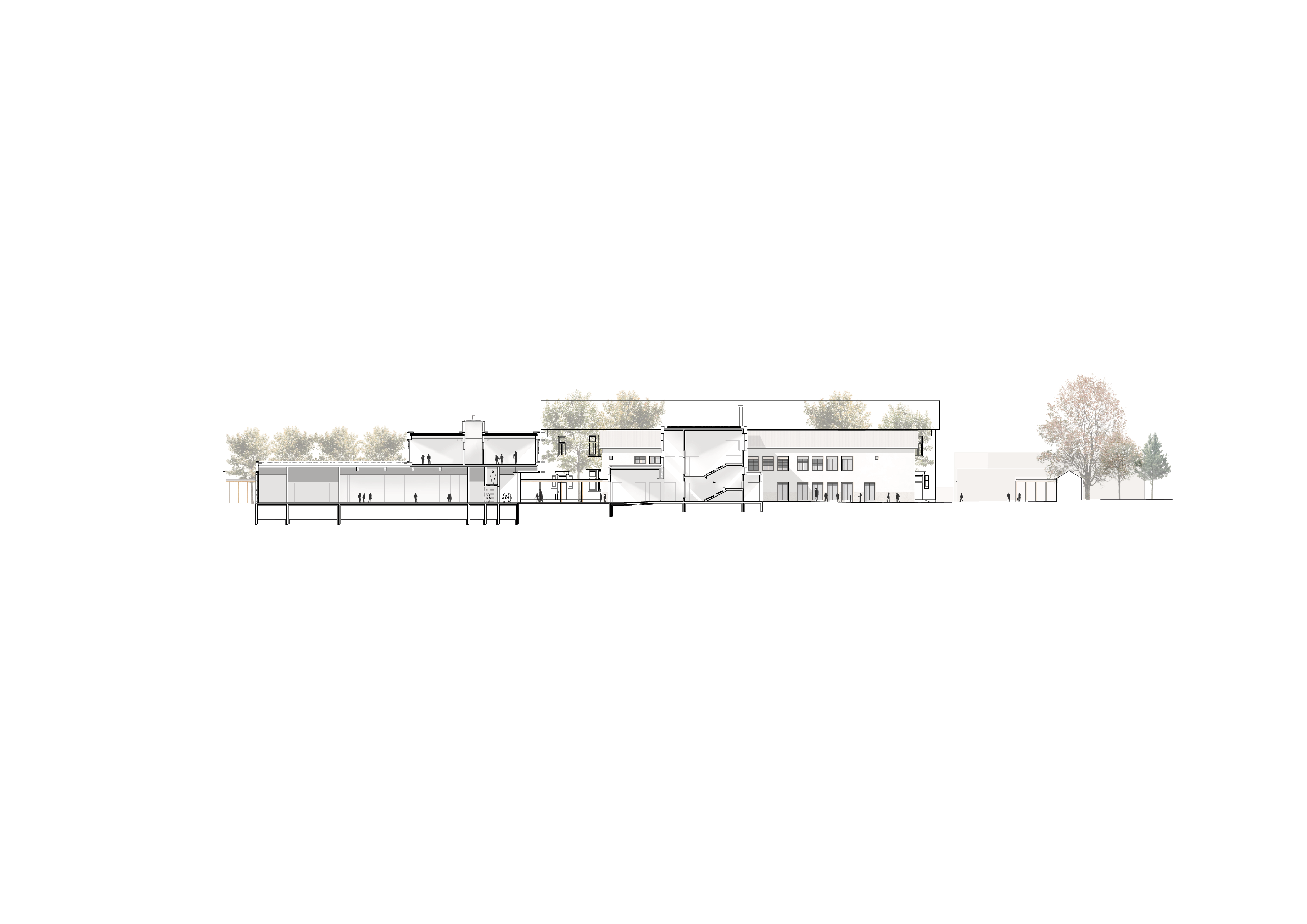 Le traitement architectural des bâtiments neufs découle de plusieurs volontés. Il ne s’agit certainement pas de « singer » les bâtiments existants mais plutôt d’utiliser les constructions neuves pour créer un « écrin » de mise en valeur de ceux-ci. Le positionnement du bâtiment principal perpendiculairement aux existants, outre les avantages fonctionnels immédiats vient mettre en tension le neuf et l’existant pour créer une véritable allée de desserte principale ente les deux et favoriser la pérennité de cette zone. Cependant son traitement architectonique (béton préfabriqué désactivé sur la rue et système bois tramé pour le reste) se veut le plus neutre possible de manière à ne pas créer de déséquilibre. Ceci se traduit par une succession de meneaux bois qui enserrent soit un élément vitré ouvrant ou non, soit un panneau de bois massif. Le rythme vertical généré répond discrètement aux baies des bâtiments existant (hors annexe de la maternelle) et « joue » avec le volume très linéaire du bâtiment neuf. La majeure partie des bâtiments neufs pourra être préfabriquée en atelier. Ce principe possède bien sur l’avantage de proposer un chantier propre, débarrassé au maximum de ses nuisances sonores et olfactives mais aussi d’en garantir la rapidité d’exécution. Ce travail en atelier permet également des assemblages de meilleure qualité générale et le contrôle des points essentiels tel que la liaison menuiseries-enveloppe pour en garantir l’étanchéité à l’air. Les bois utilisés seront traités et composés essentiellement de douglas et mélèze.