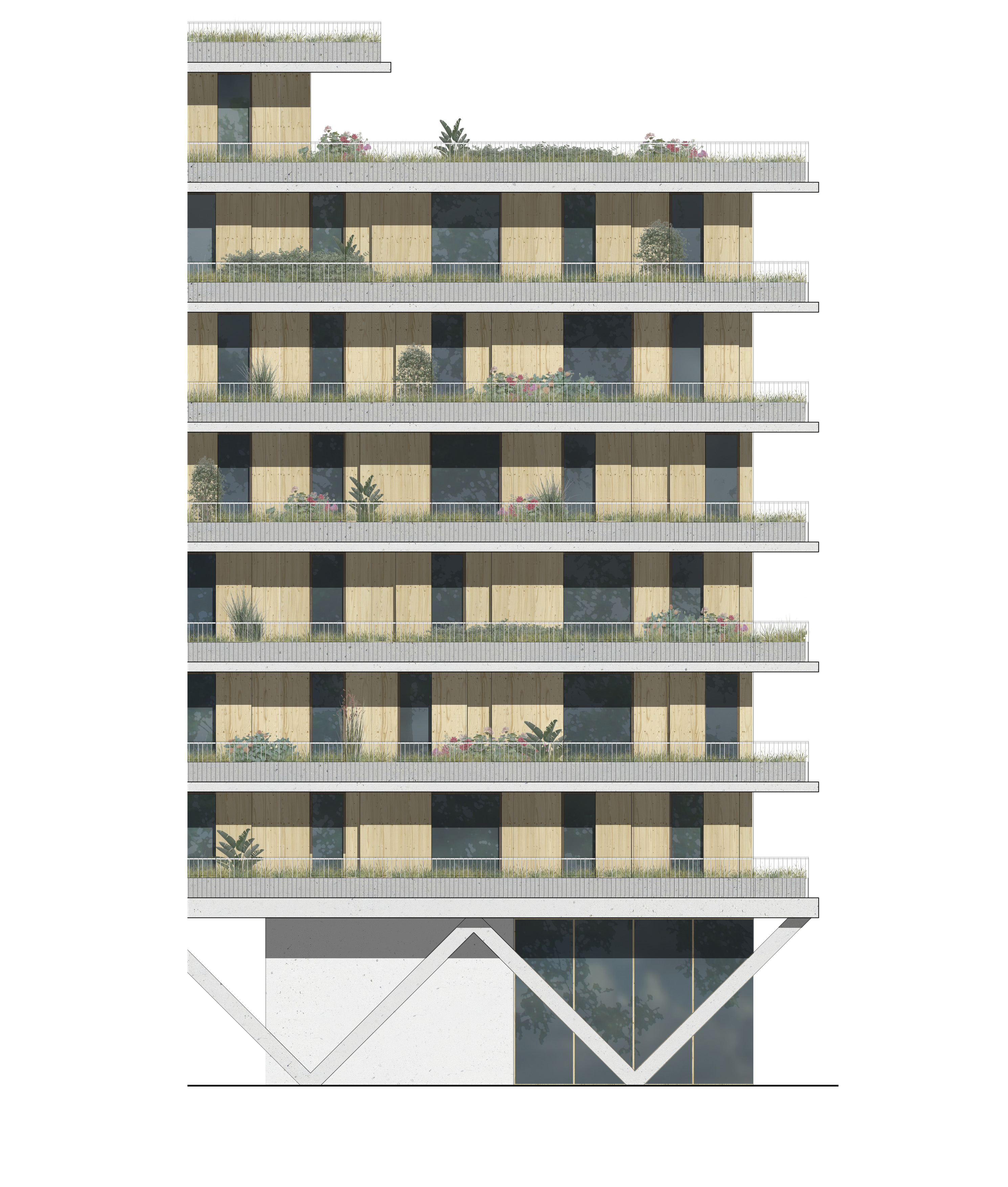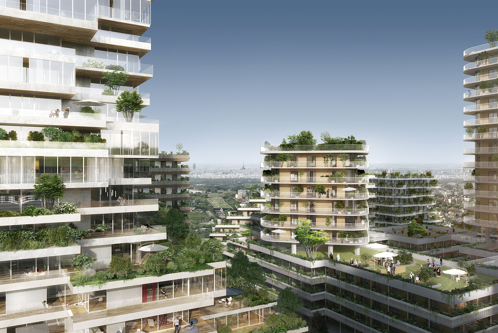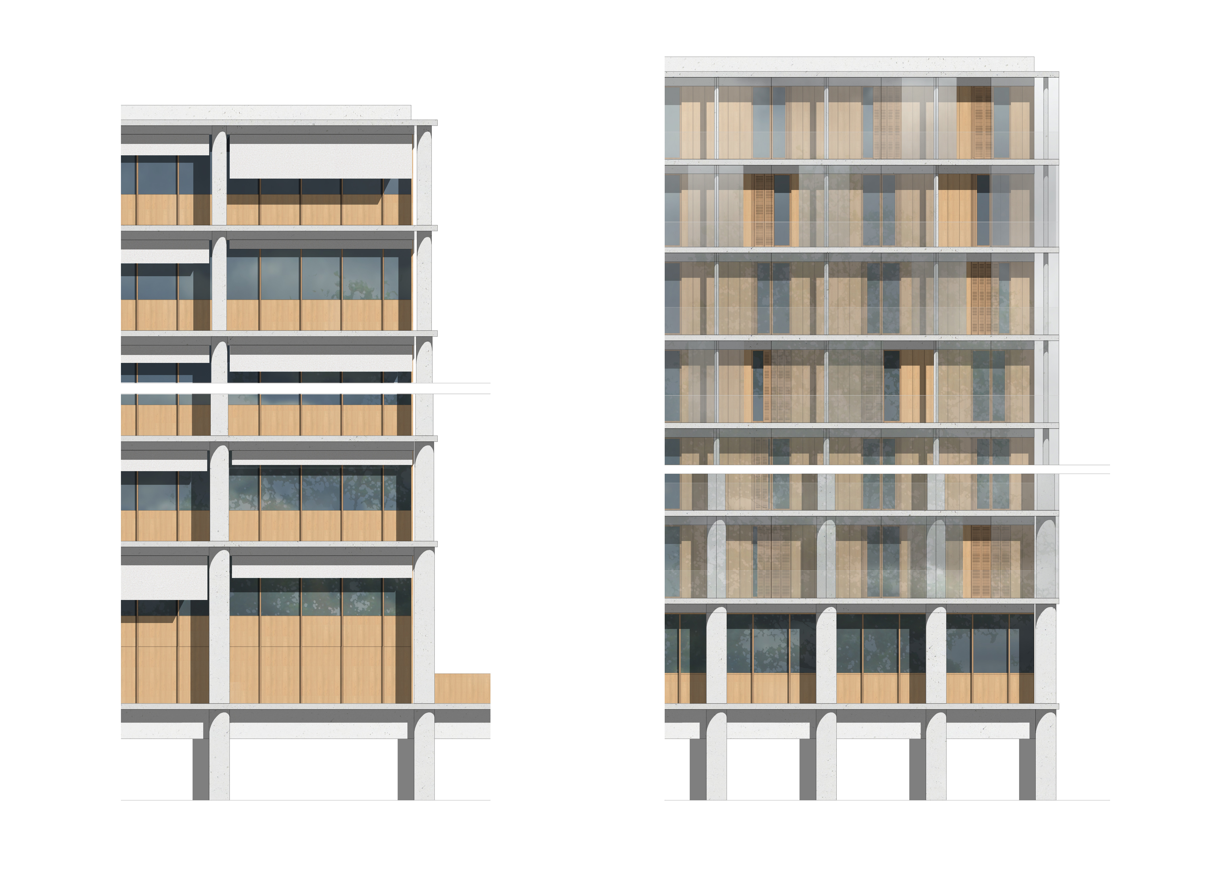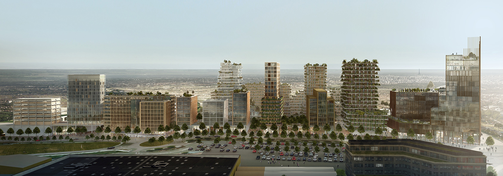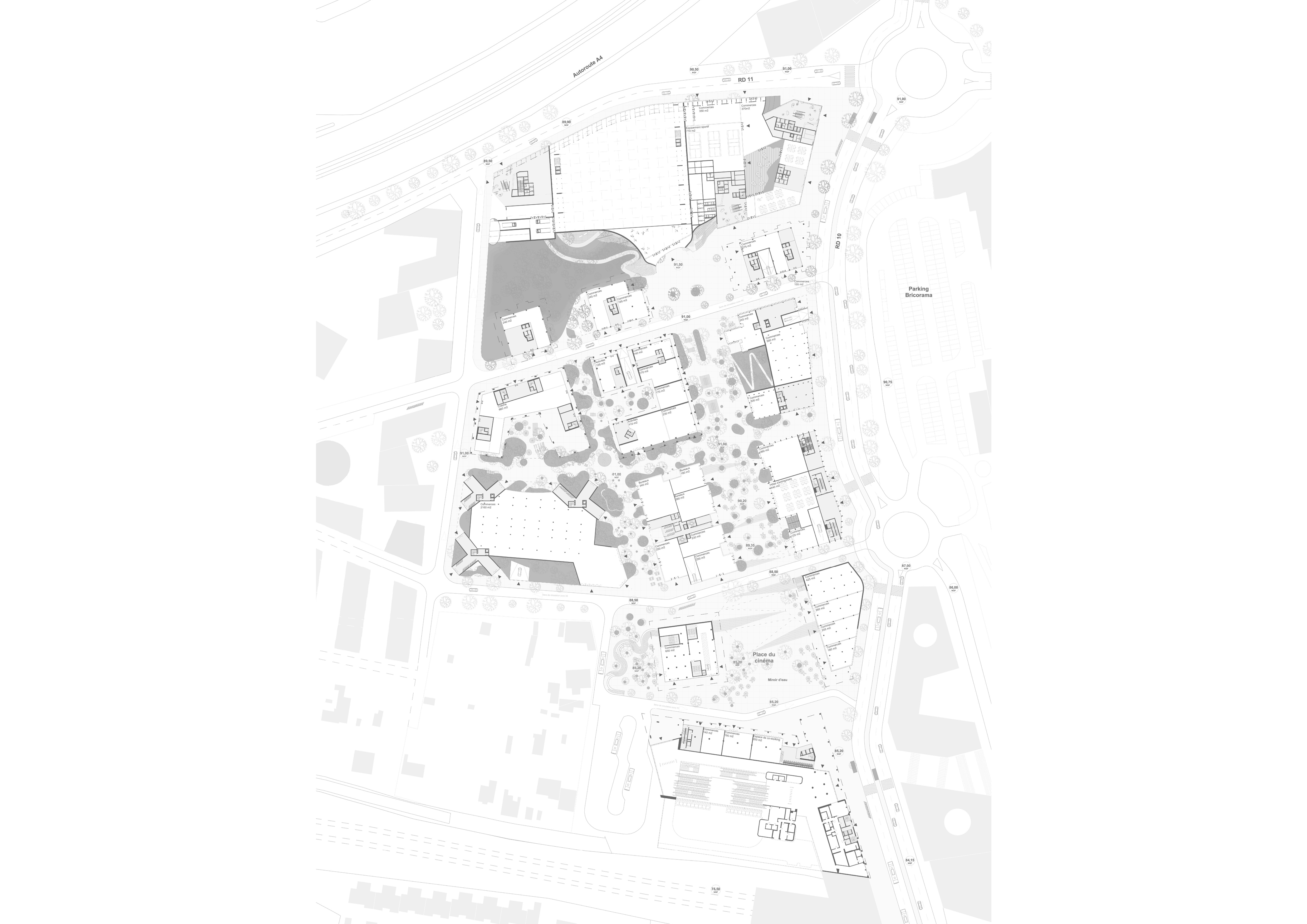 Elaboré dans le cadre du concours ‘‘Réinventons la métropole du Grand Paris’’, par les agences AAAVP architecture, BASE, Marc Barani Architectes, Aires Mateus e Associados, Hamonic + Masson & Associés et Véra & Associés, le projet urbain, intitulé ‘‘PanoraMarne’’, s’appuie sur le plan urbain dessiné préalablement par l’Atelier Ruelle. Sur un terrain anciennement en réserve pour le passage d’une voie rapide , et tirant parti du projet d’implantation d’une Gare du Grand Paris à la croisée des communes de Villiers-sur-Marne, Bry-sur-Marne et Champigny-sur-Marne, le projet propose l’établissement d’une mixité programmatique et d’une forte densité. Le projet est régi par un axe Nord-Sud, le ‘‘Jardin métropolitain’’, offrant un espace public qualifié par des commerces et activités en rez-dechaussée, et s’ouvrant sur de larges étendues végétalisés et apaisées dans lesquelles viennent s’ancrer les bâtiments dédiés au logement. La façade Est de l’ensemble, ouverte sur la voie de passage du bus ‘‘altival’’, qui accueille majoritairement des espaces de bureaux, est conçue dans une logique de sobriété, neutralité et d’expression qualitative de sa matérialité, essentiellement le bois. Une attention particulière est accordée à l’échelle du piéton.